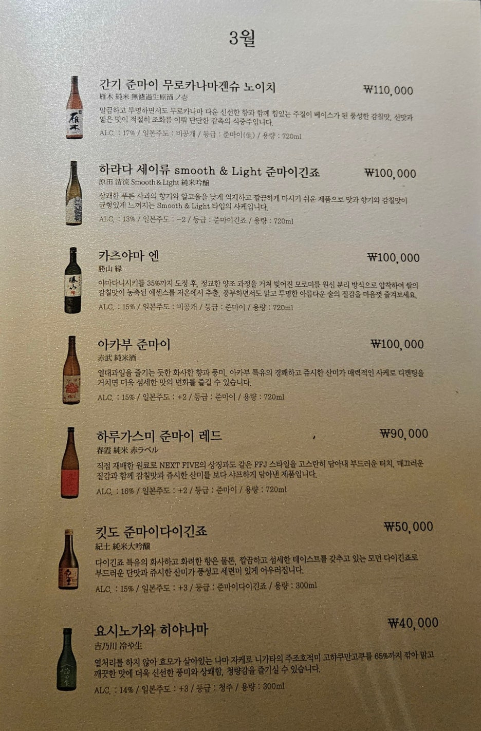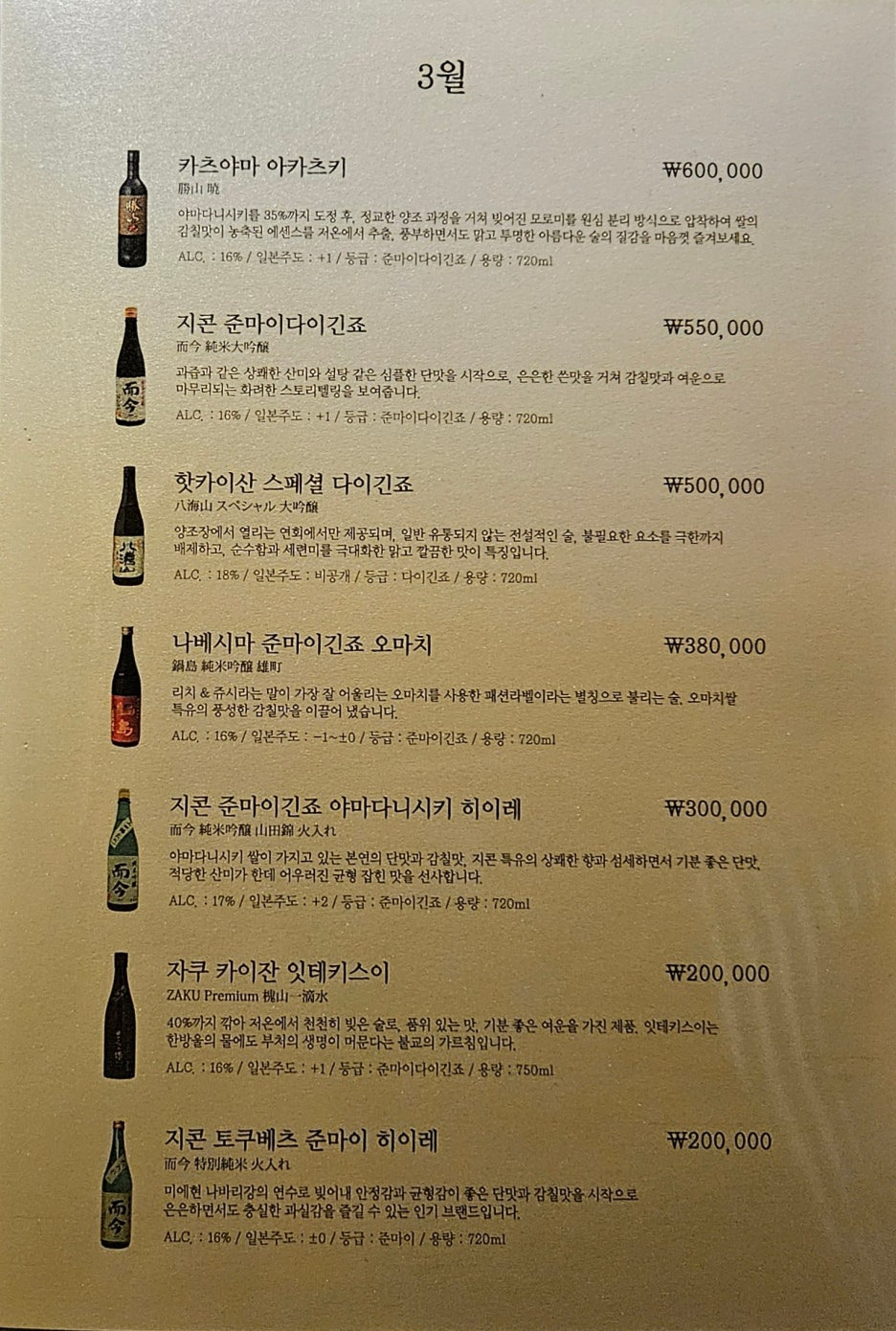 매달 바뀐다는 주류 메뉴판. 매달 새로운 사케를 준비하신다니 참 부지런하시기도 하다.