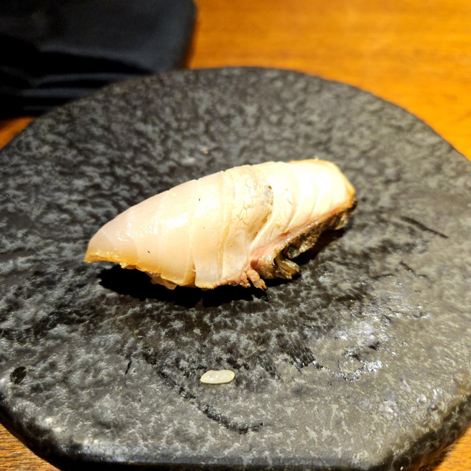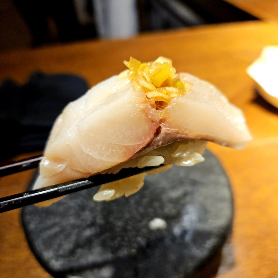 깔끔하면서도 고소한 맛. 역시 맛있다. 샤리의 초의 강도가 다소 약해져서 오히려 이런 흰 살 생선과는 궁합이 더 잘 맞는 듯. 특히, 야쿠미로 들어간 구운 파는 최고의 악센트.