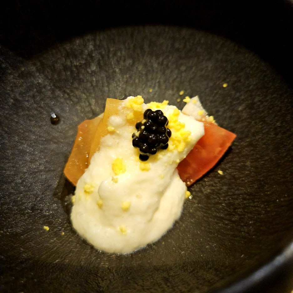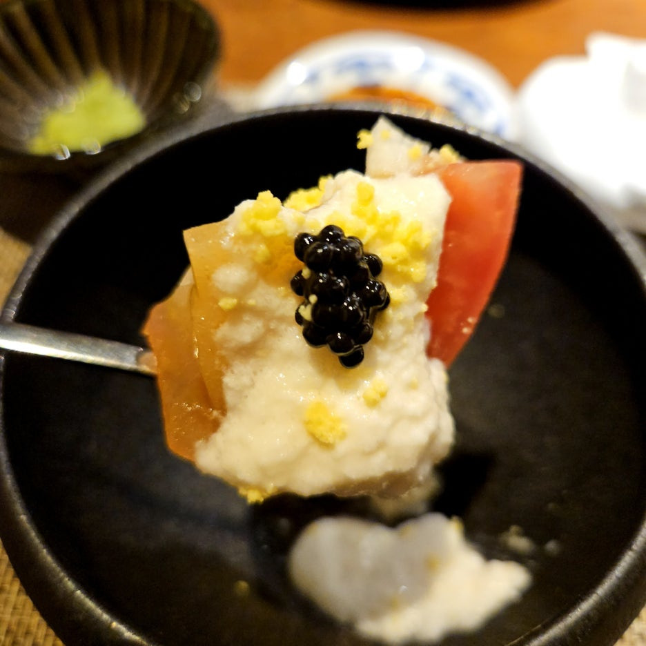 부드럽게 간 마와 토마토에 치즈를 곁들였다고 한다. 가장 위에 올라가 있는 것은 청어알.