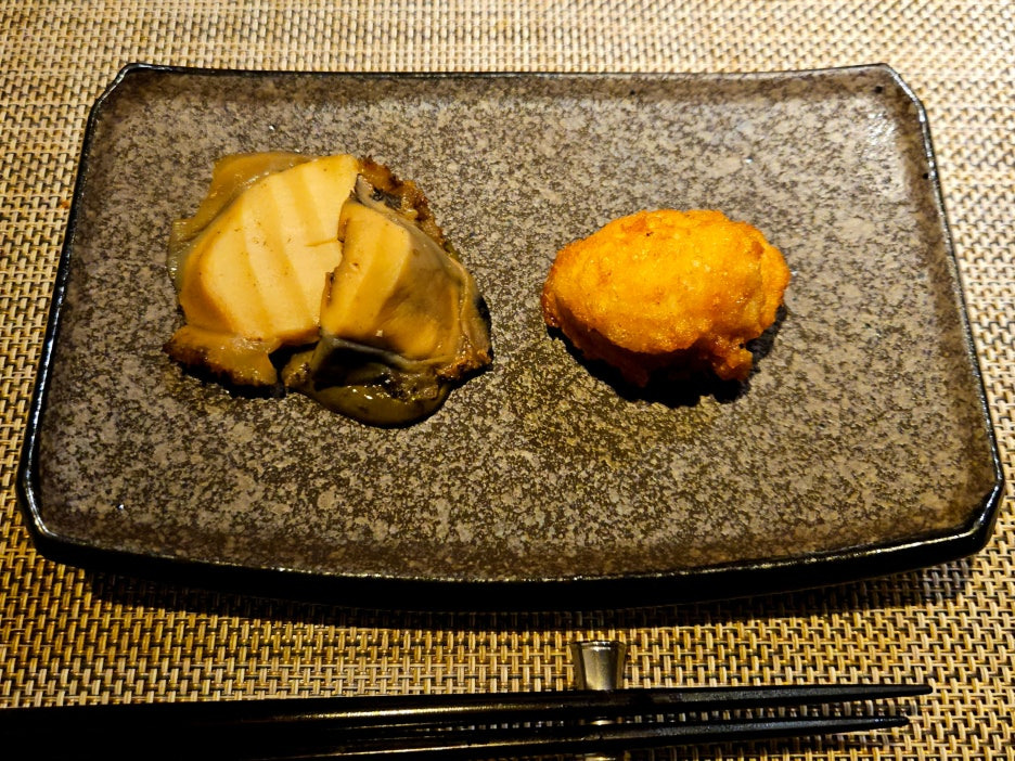오랜 시간 쪄낸 전복과 쉽게 접하기 힘든 고급 재료인 복 정소 튀김.