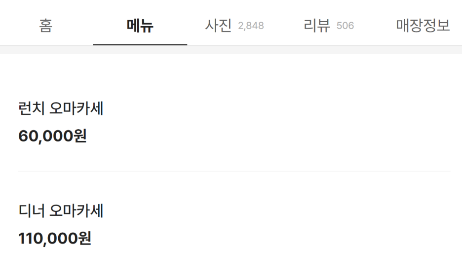 영업시간: 런치 6만원 (12시) / 디너 11만원 (1부 6시, 2부 8시)