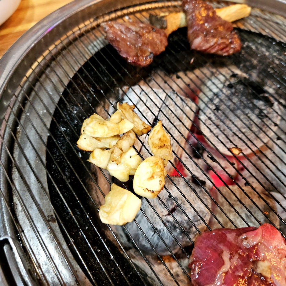 뒤이어 불판에 올라간 마늘 갈비. 갈비 위로 양념에 있던 마늘을 정성스레 하나씩 배치 시켜본다.