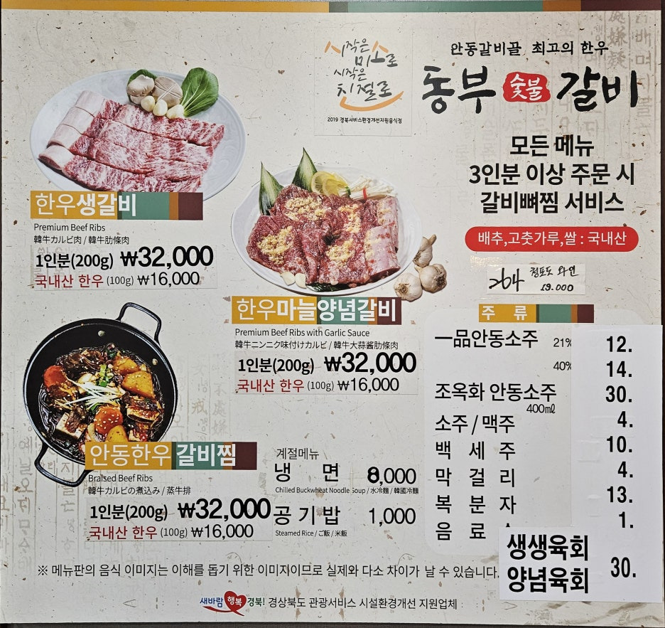 생갈비 2인분과 마늘갈비 1인분으로 주문. 3인분 이상을 주문하면 갈비뼈 찜을 서비스로 내어주는 안동 갈비 골목의 특징상 무조건 3인분은 시켜야 할 듯하다.
