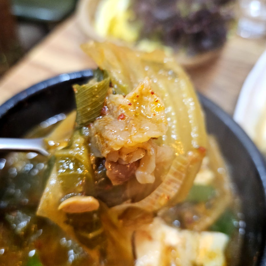엄청나게 다양한 재료들로 가득한 된장찌개.