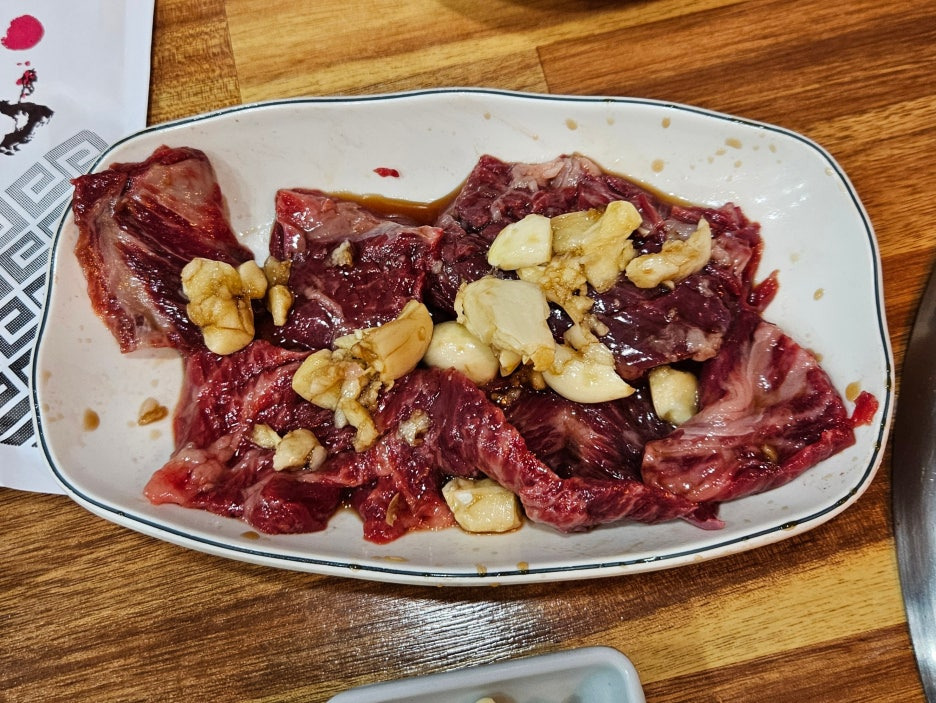마늘 양념이 과하게 올라가 있는 마늘 갈비. 양념된 갈비는 마블링이 그렇게 중요한 것은 아니다. 하지만, 이 마늘 갈비도 그리 좋은 비주얼은 아니었다.