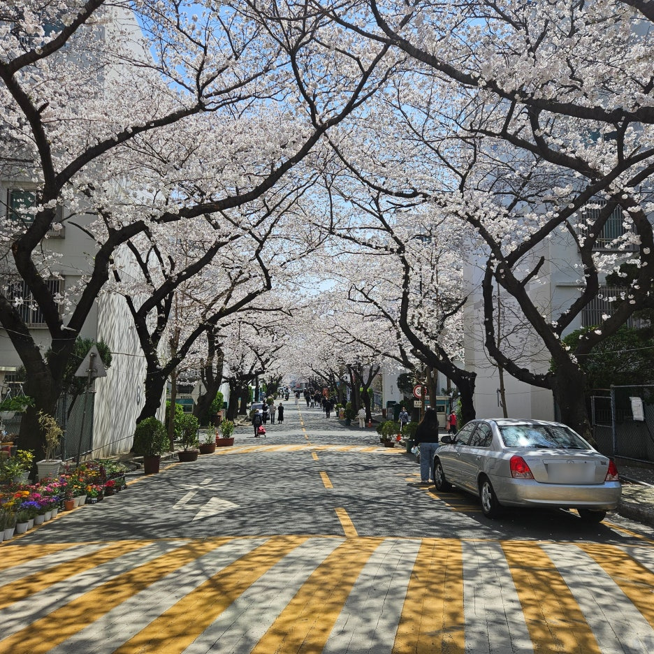 영남 냉면 밀면을 가는 길에, 과거에는 엄청난 부자 동네였던 삼익아파트 단지가 있다. 엘리베이터도 없는 5층짜리 아파트 단지에는 수십이 넘은 벚나무들이 줄지어 서있다. 마침 부산은 벚꽃이 만개한 시절이라 밀면 먹으러 가다 잠시 구경.
