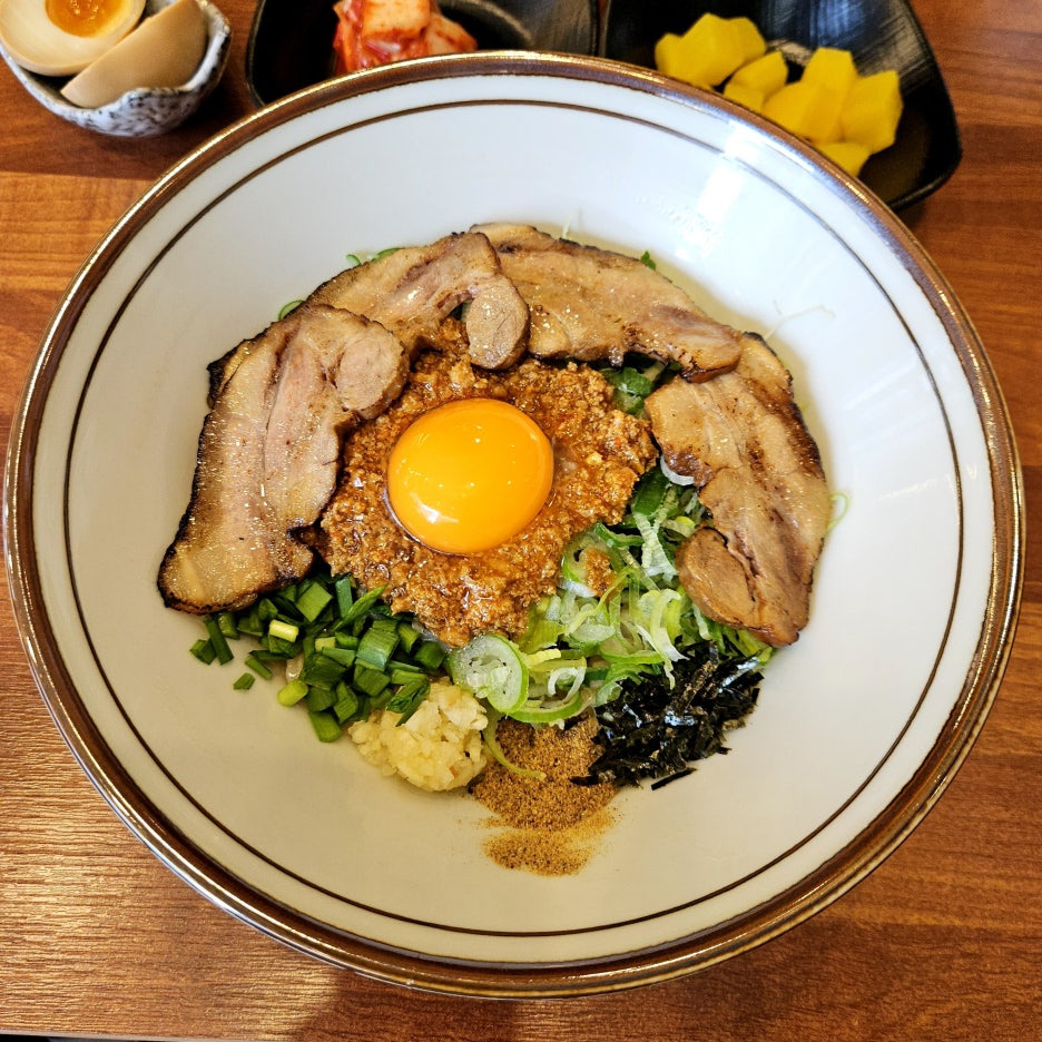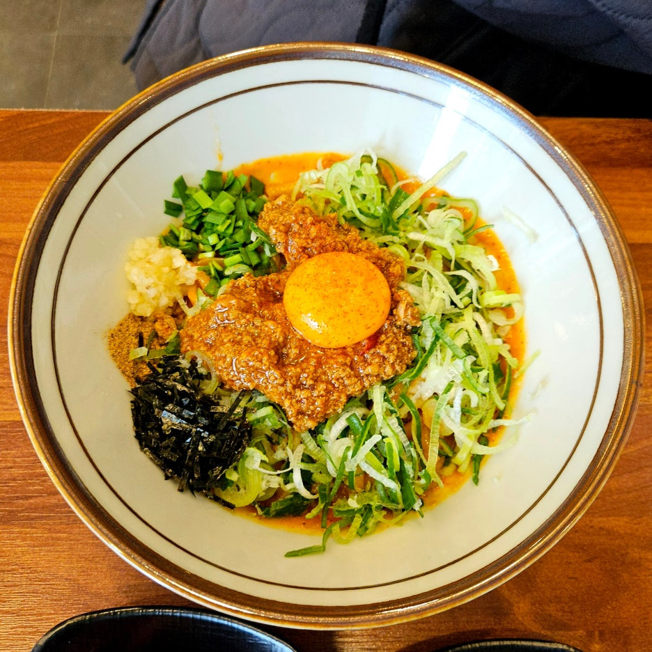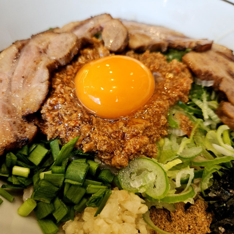 일반 마제 소바에 매운맛이 추가된 버전. 노른자 위에 빨간 양념들이 보인다.