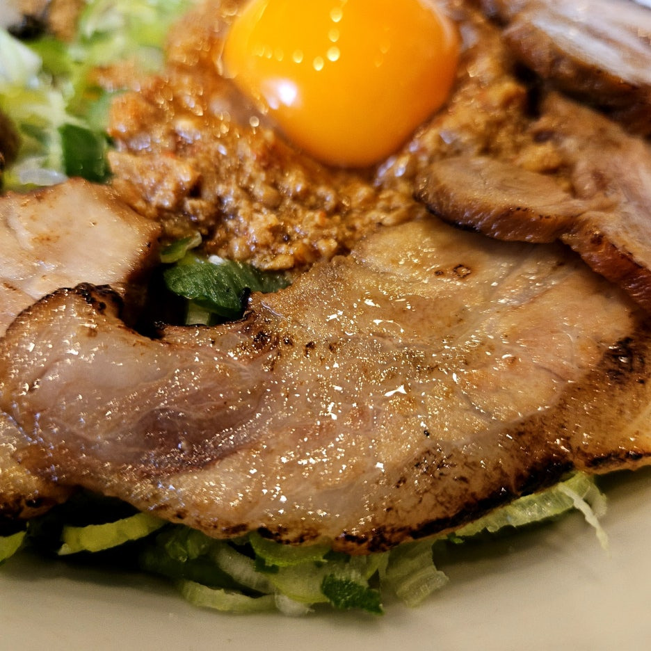 일반 마제 소바에 차슈가 추가된 메뉴. 불질로 잘 구워진 차슈가 4장 올라가 있는 모습.