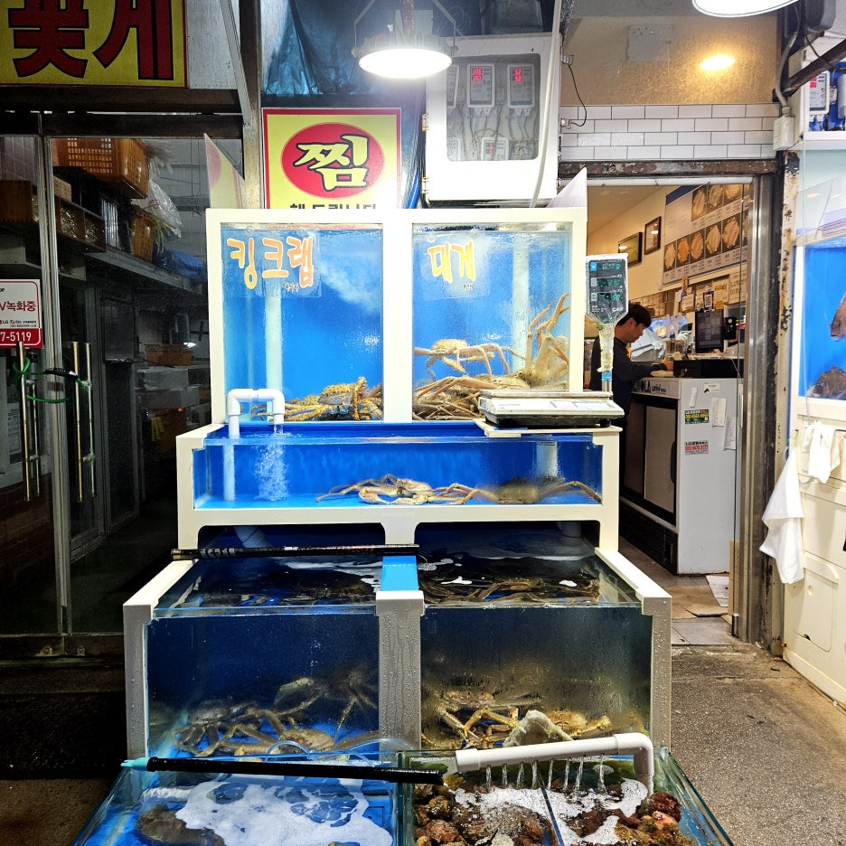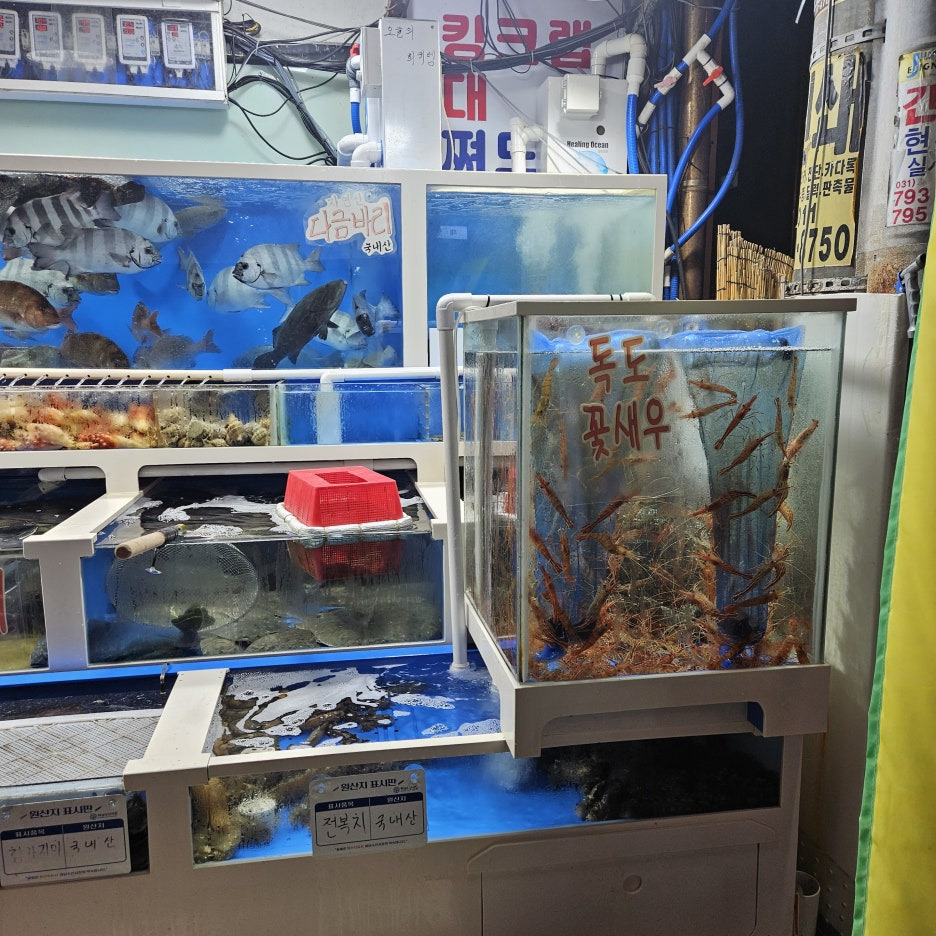 수조에는 정말 다양한 종류의 생선들이 있다. 줄돔, 숭어, 광어 등 웬만한 유명 횟감들은 다 있고, 봄철 주꾸미도 보인다. 무지막지하게 비싼 독도 꽃새우도 있긴 하지만, 먹어보기에는 비쌀 듯.