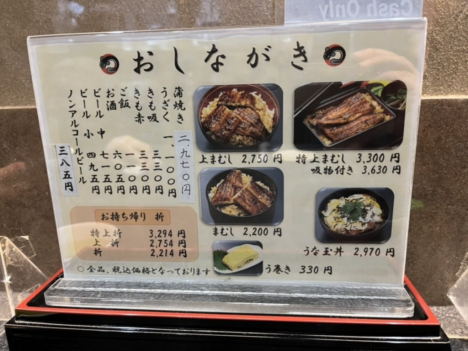 메뉴는 이러하다. 제일 비싼 3300엔의 특상 우나기부터 조금 싼 2200엔의 장어덮밥까지 준비되어 있긴 하지만, 역시 장어는 비싸다.