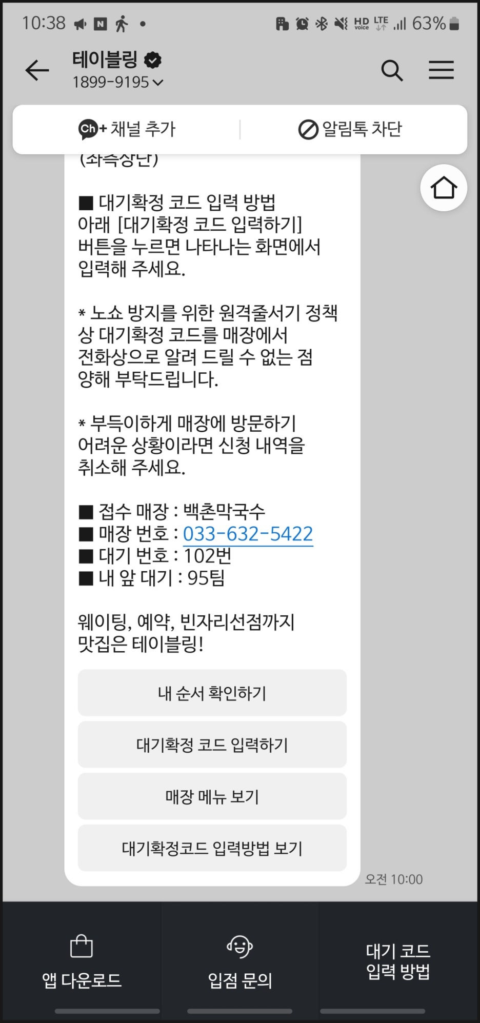 아래 스샷의 핸드폰 시간은 10시 38분이지만, 실제로는 10시에 원격 줄서기를 했다. 결과는 102번. 한 30초 정도 늦었는데, 결과는 102번이라는 대참사. 엄청나다.
