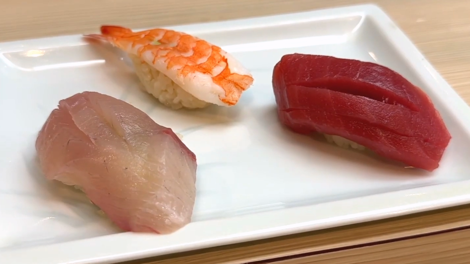 다음은 새우와 아카미. 그리고, 나머지 하나는 아마도 칸파치. 재료도 훌륭하고, 샤리도 적초를 사용하여 좋다.