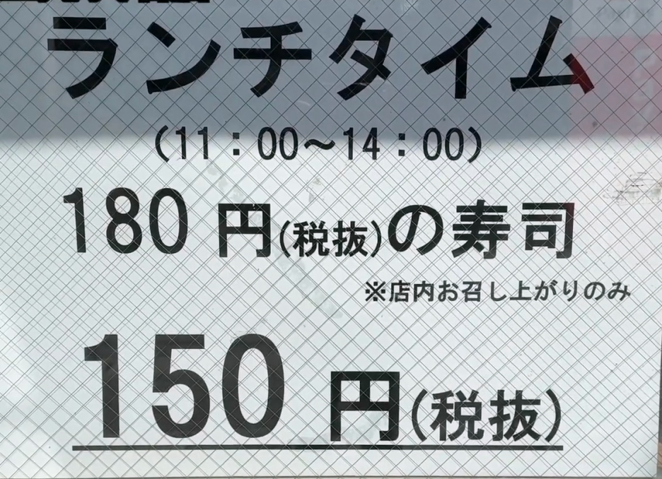 앞서 소개한 다른 스시집들과는 다르게 이곳은 세트 메뉴가 없다. 하지만, 런치 타임인 11시부터 14시까지는 원래 180엔이었던 스시를 150엔으로 할인된 가격으로 먹을 수 있다는 것이 인기의 이유. 150엔이지만 세금을 포함하면 165엔이다.