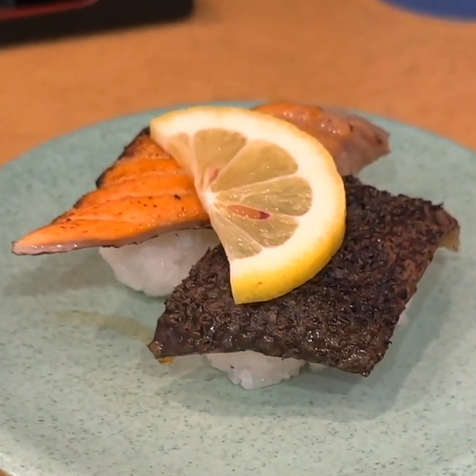 달달하고 부드러운 가리비 231엔. 독특한 스시인 연어 껍질 아부리 165엔 (런치가격).