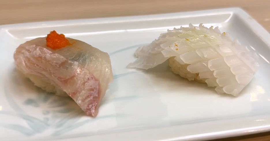 먼저 나온 스시는, 광어와 오징어. 샤리와 네타가 모두 크기가 크다. 점심으로 배 채우기에 아주 좋다. 오징어 스시는 유자 껍질을 함께 사용해서 상큼함도 같이 느껴진다.