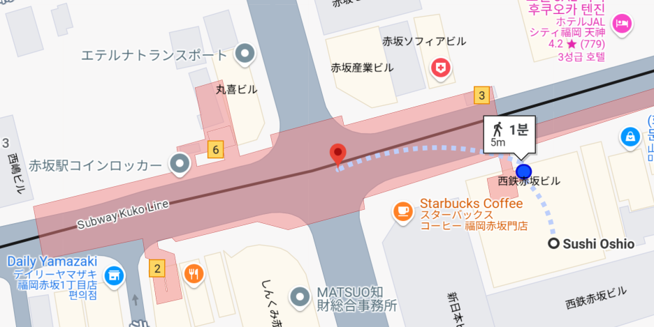 텐진역에서는 살짝 멀지만 아카사카역에서는 가까운 회전스시 후지마루 다이묘점. 후쿠오카 현지인들에게 아주 인기가 많은 집이다. 저렴한 가격에 원하는 스시를 주문해서 먹을 수 있는 곳으로 점심에는 대기가 많다고 한다.