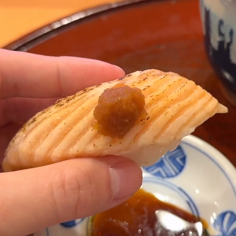 스시 코스 중 가장 훌륭해 보이는 콘부지메 시메사바. 다시마를 얇게 저며서 만든 시로 콘부를 얹어 감칠맛을 극대화 시킨 시메사바. 아부리를 한 연어는 기름기가 폭발하는 맛. 유즈코쇼가 들어가 있어 느끼함을 완벽하게 잡아준다.
