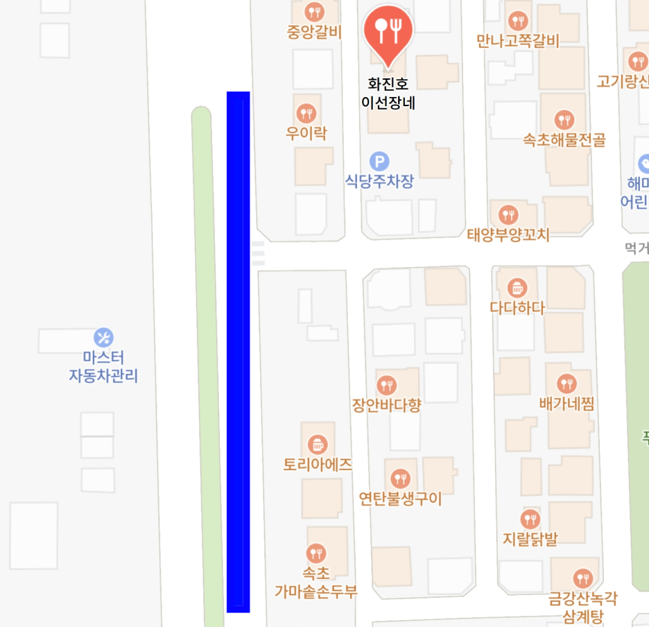 주차는 매장 앞에 약 3대만 가능하다. 이미 그곳은 자리가 없었다. 다음으로 가능한 곳은, 이곳으로 들어오는 큰길의 주차구획이 있다. 대략 파란색으로 표시된 곳을 이용하면 된다.