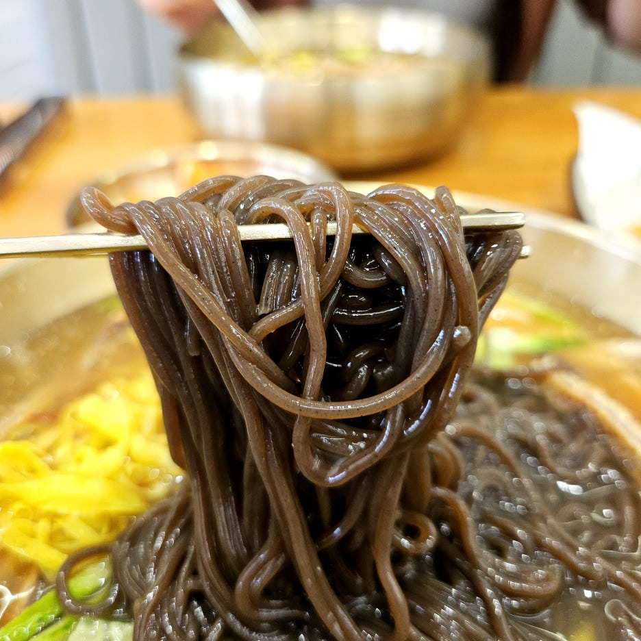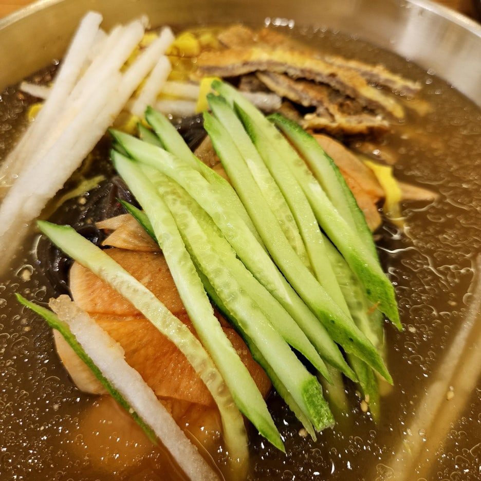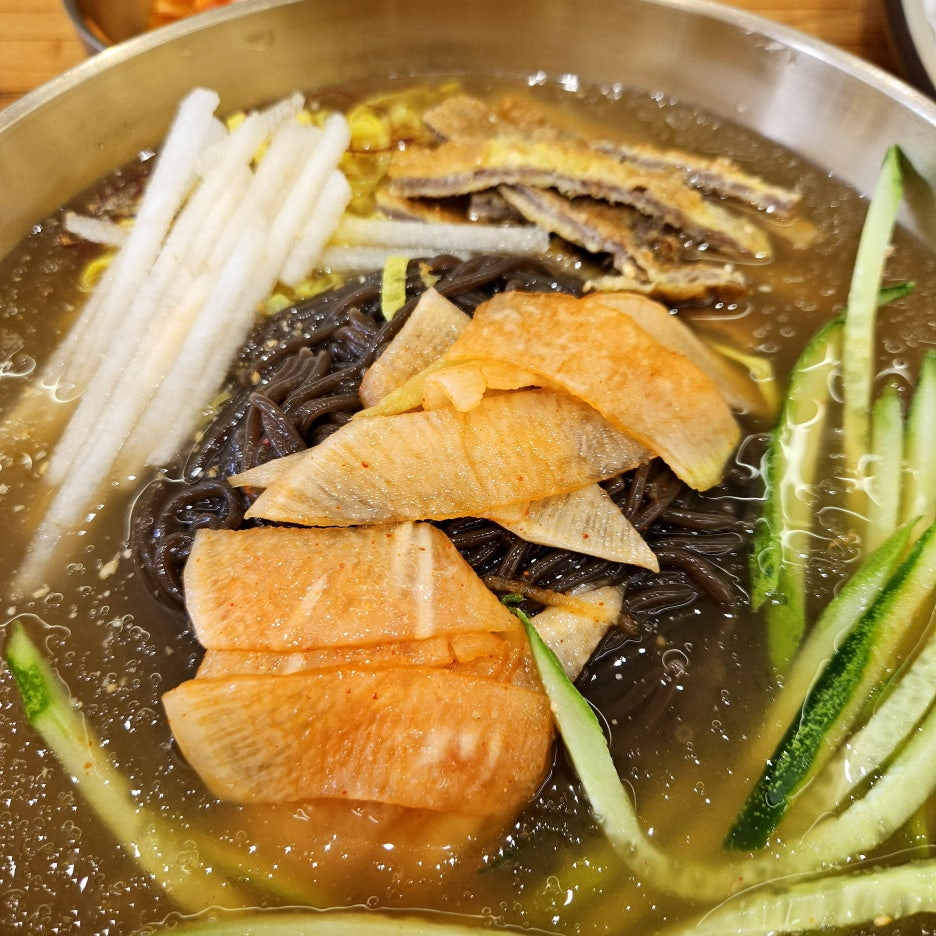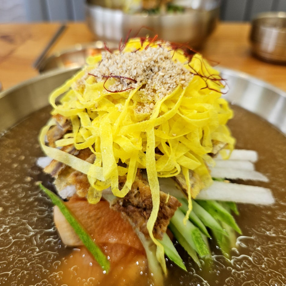 마지막으로 칡 냉면스러운 면. 평양냉면과는 달리 쫄깃한 식감을 가진 면. 아마도 메밀의 함량은 높지 않으리라.