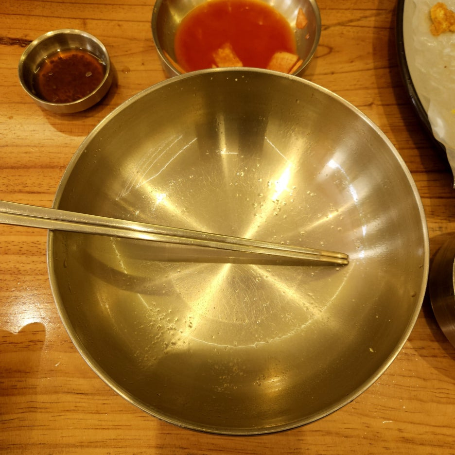냉면의 시원한 육수를 그대로 따뜻하게 만든 느낌. 해물 육수 베이스이지만, 가쓰오부시 향이 좋아서 비리거나 하는 느낌은 전혀 들지 않았다. 깔끔하게 애피타이저로 좋은 맛.
