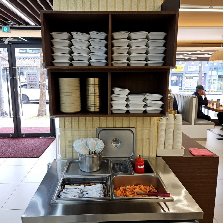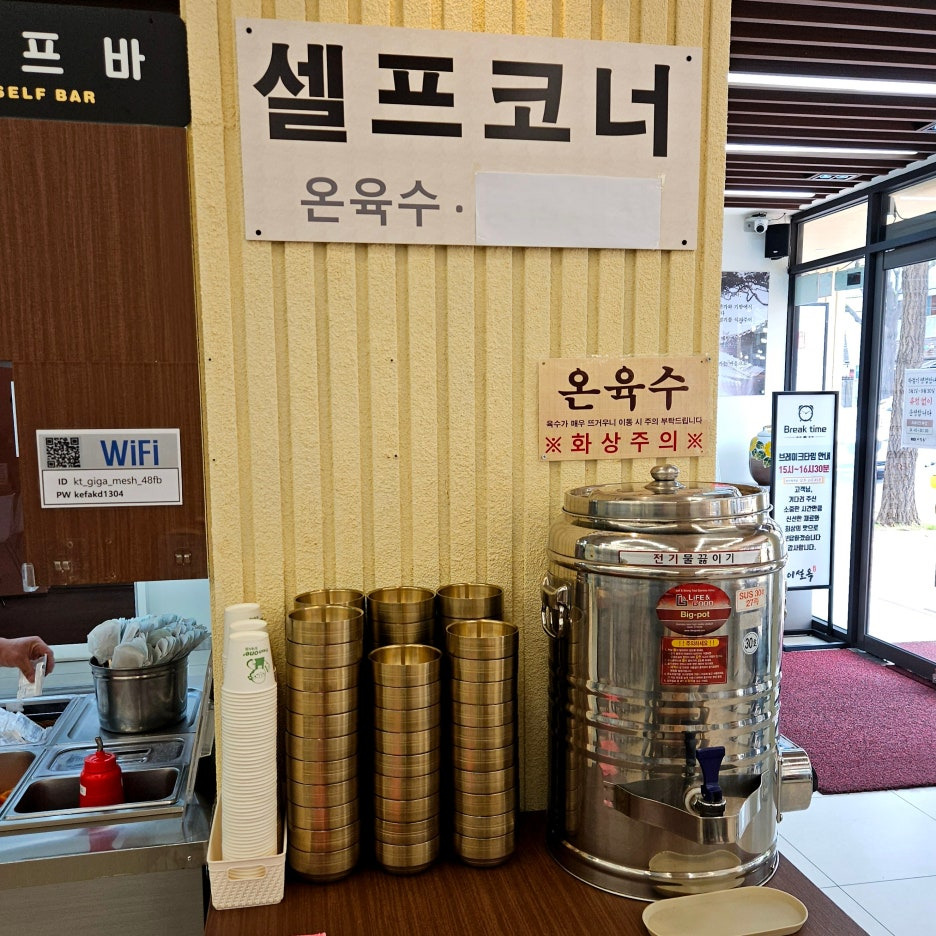 11시 오픈한 지 10분 정도 밖에 지나지 않았음에도 손님은 꽤 있다. 가족단위 손님도 있고, 혼자 오신 분도 있는 모습. 음식이 나올 때까지 지난번에는 보지 못한 듯한, 온육수가 있길래 한잔 가져와 봤다.