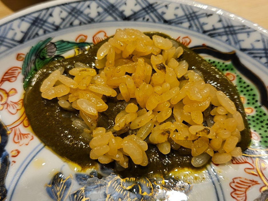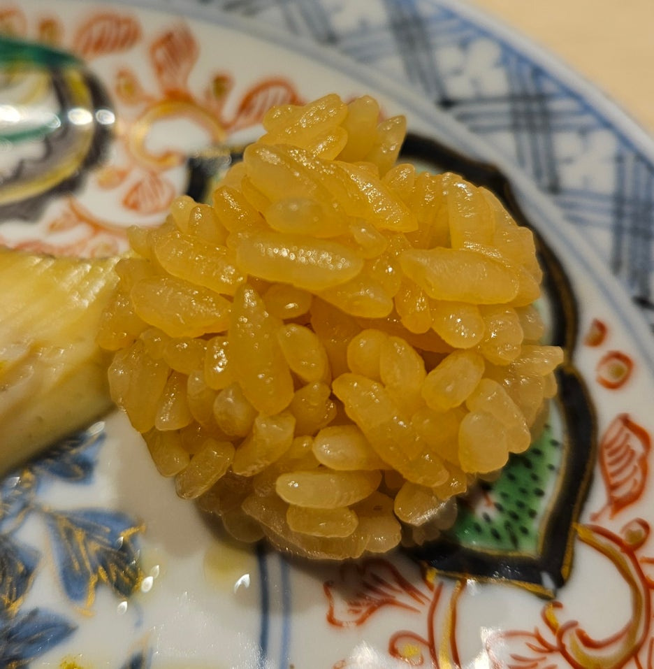 샤리를 조금 내어준다. 샤리의 색이 어둡길래 여쭤보니, 흑초와 적초를 적절히 배합하여 사용하신다고 한다. 그렇다 보니 산미가 꽤 있다.