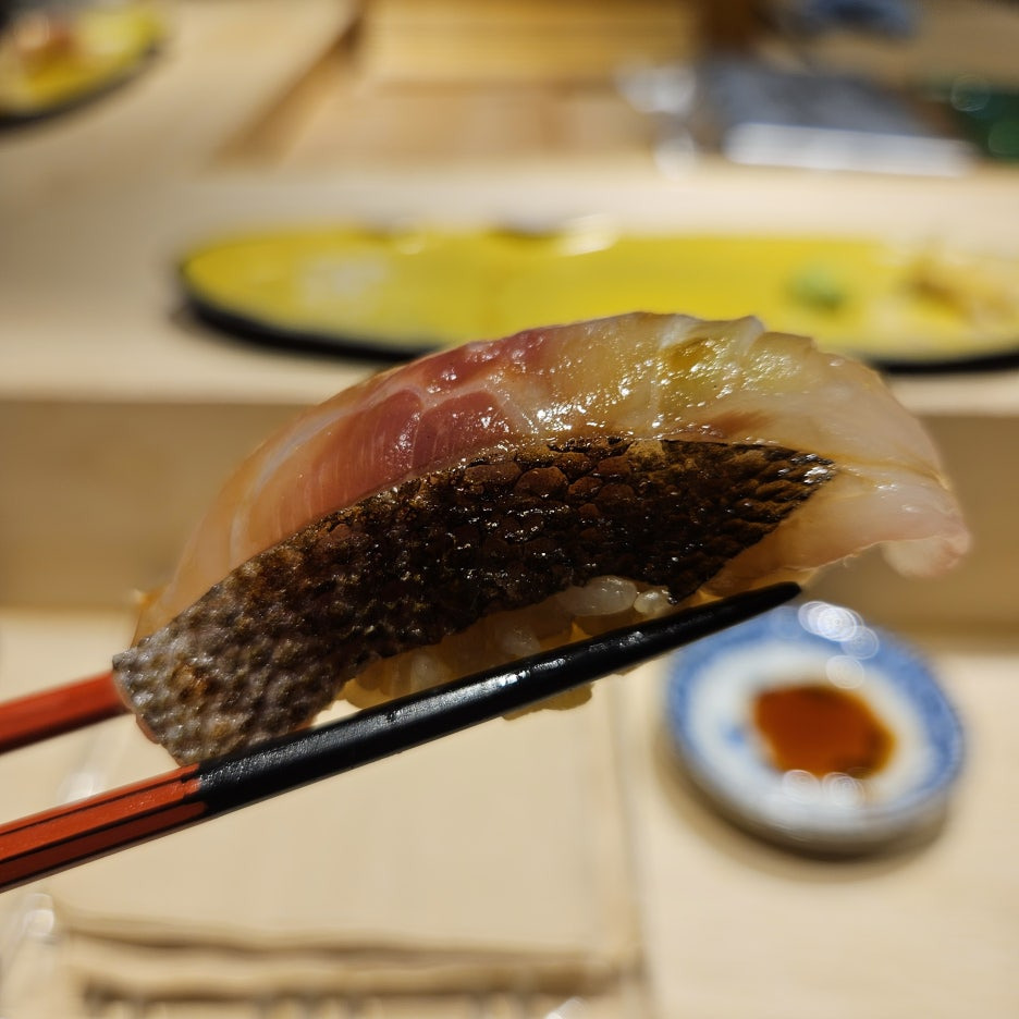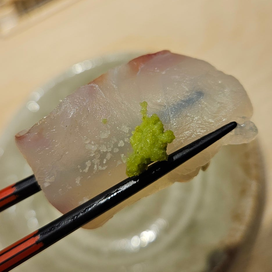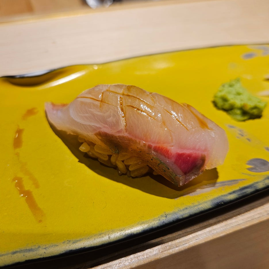 그런데, 여기서 해프닝 발생. 시마아지 대신에 실수로 칸파치(잿방어)를 네타로 사용하신 셰프님. 그래서 받은 잿방어 스시. 셰프님의 실수라 이건 비용을 안 받겠다고 하시길래, 아니라고 어차피 고민하던 녀석이었으니 비용에 넣어달라고 말씀드리고 맛있게 먹었다.