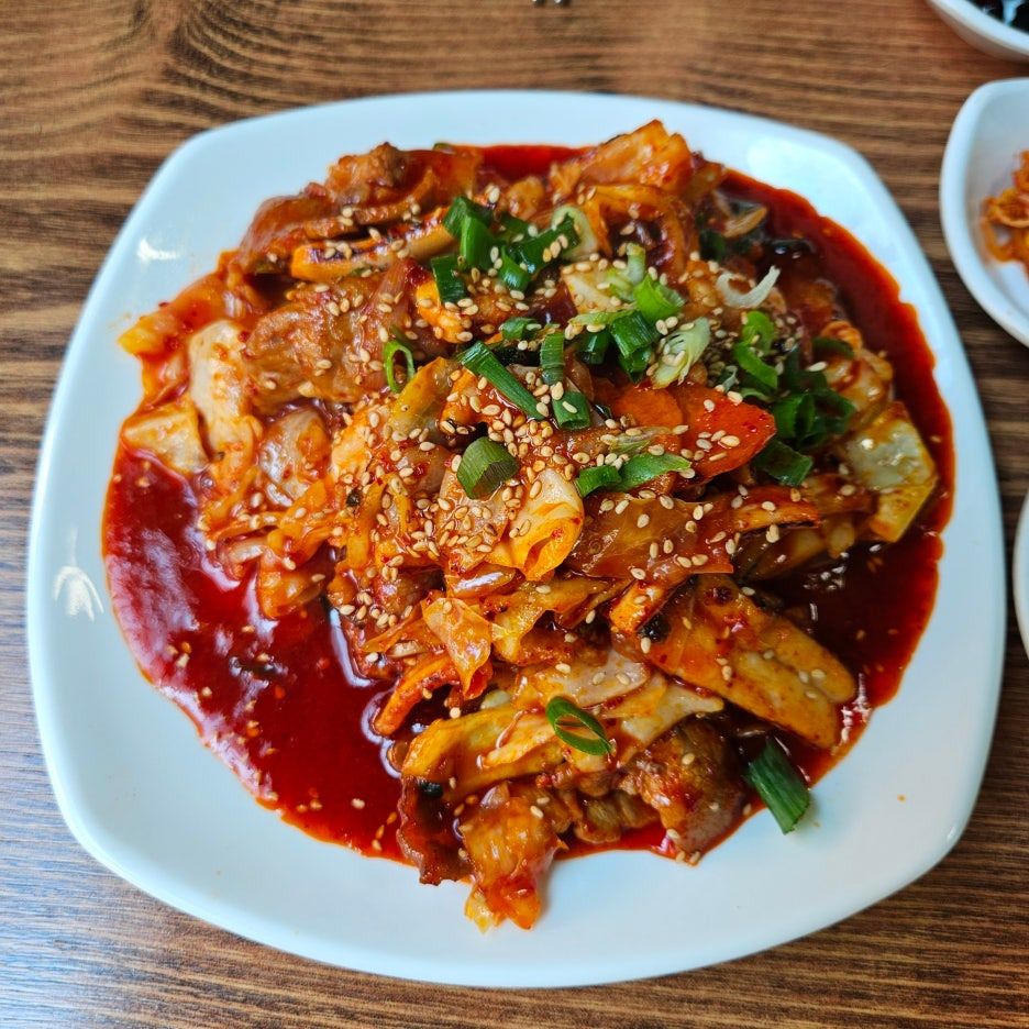 주재료인 오징어와 돼지고기와 함께, 양배추, 파, 양파 등이 양념에 잘 볶아져서 나온 모습. 불향은 거의 느껴지지 않았지만, 진득한 기름기가 고소한 느낌.