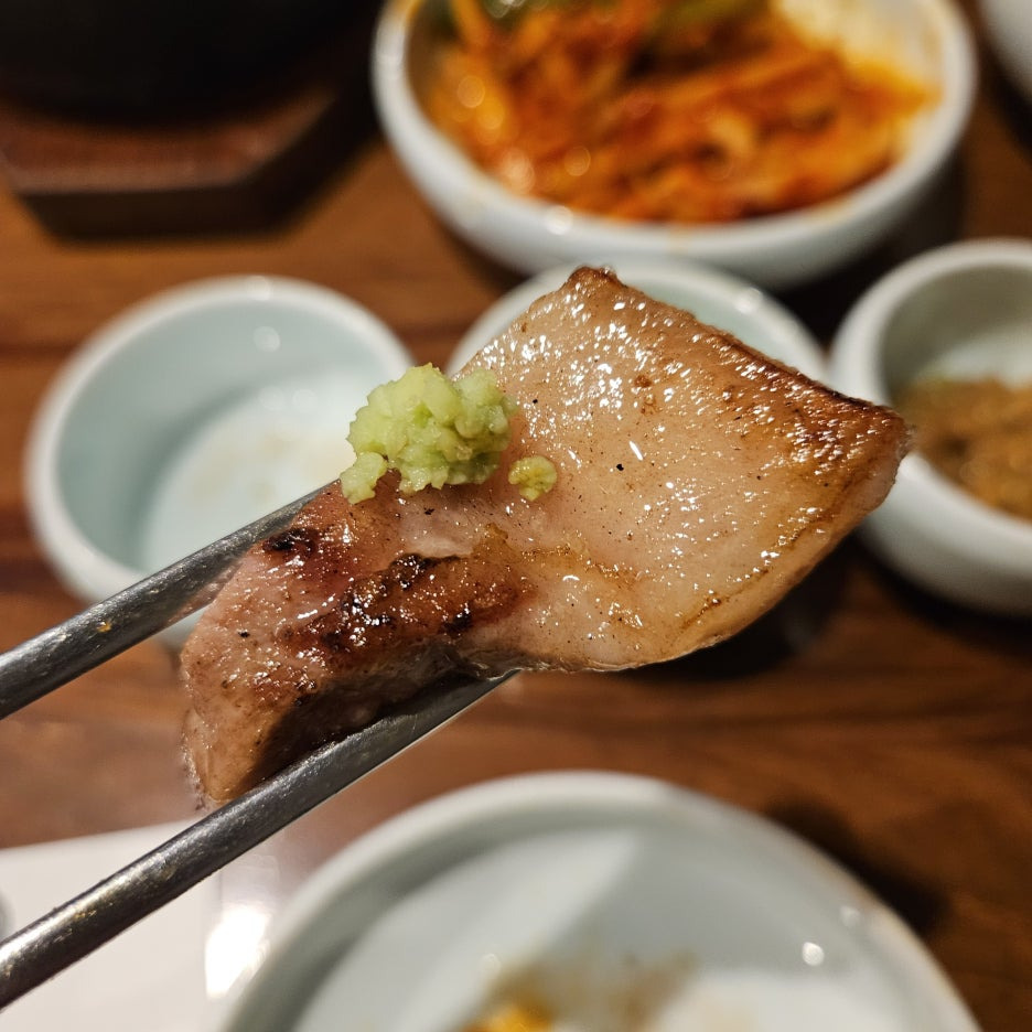 온담은 직원분께서 직접 고기를 구워주신다. 아주 편하다. 그리고, 그릴링 스킬도 좋아서 완벽한 상태로 먹을 수 있게 해주신다. 아주 좋다. 아, 사진에 살짝 보이는 맬젓도 맛있다. 비린 향이 전혀 없고 살짝 달달한 느낌으로 쌈장과 유사한 맛.