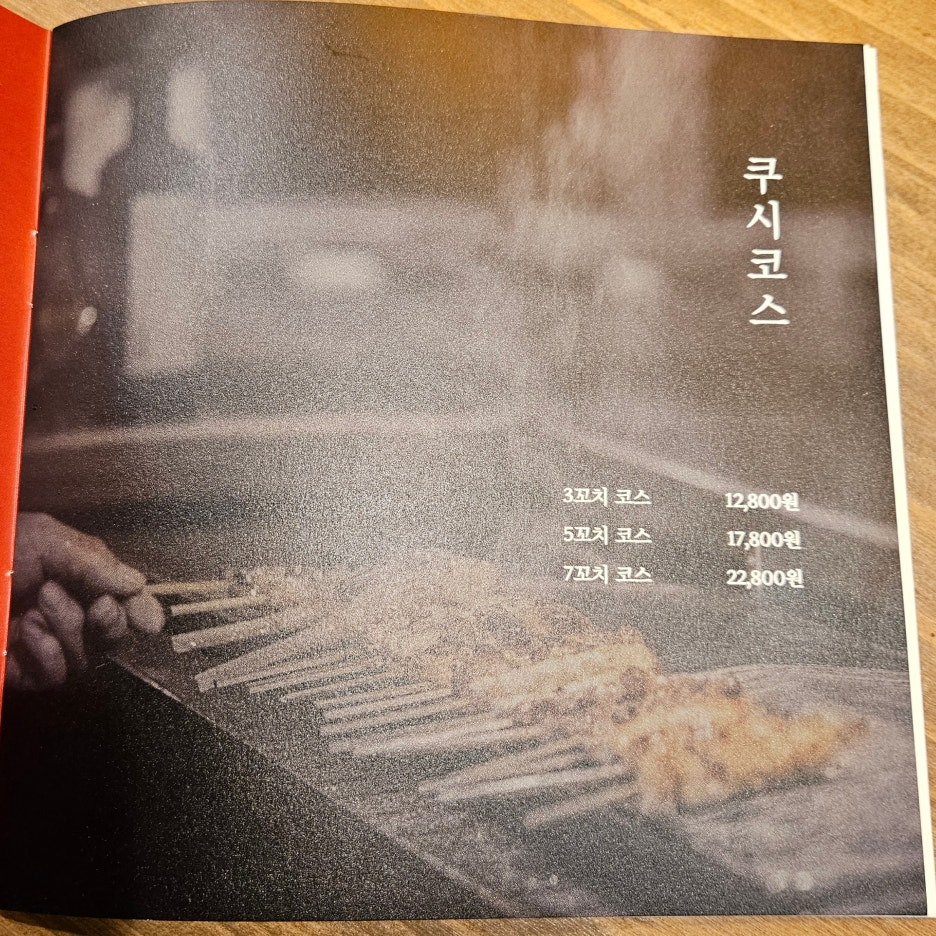 이곳에서는 첫 주문은 쿠시 코스로 주문을 해야 하는 시스템. 이후에는 단품으로 주문이 가능하다. 처음 방문한 우리는 적당하게 나오는 5꼬치 코스 17,800원으로 시작한다. 이 가격은 1인 가격이다. 2명이면 곱하기 2가 된다.