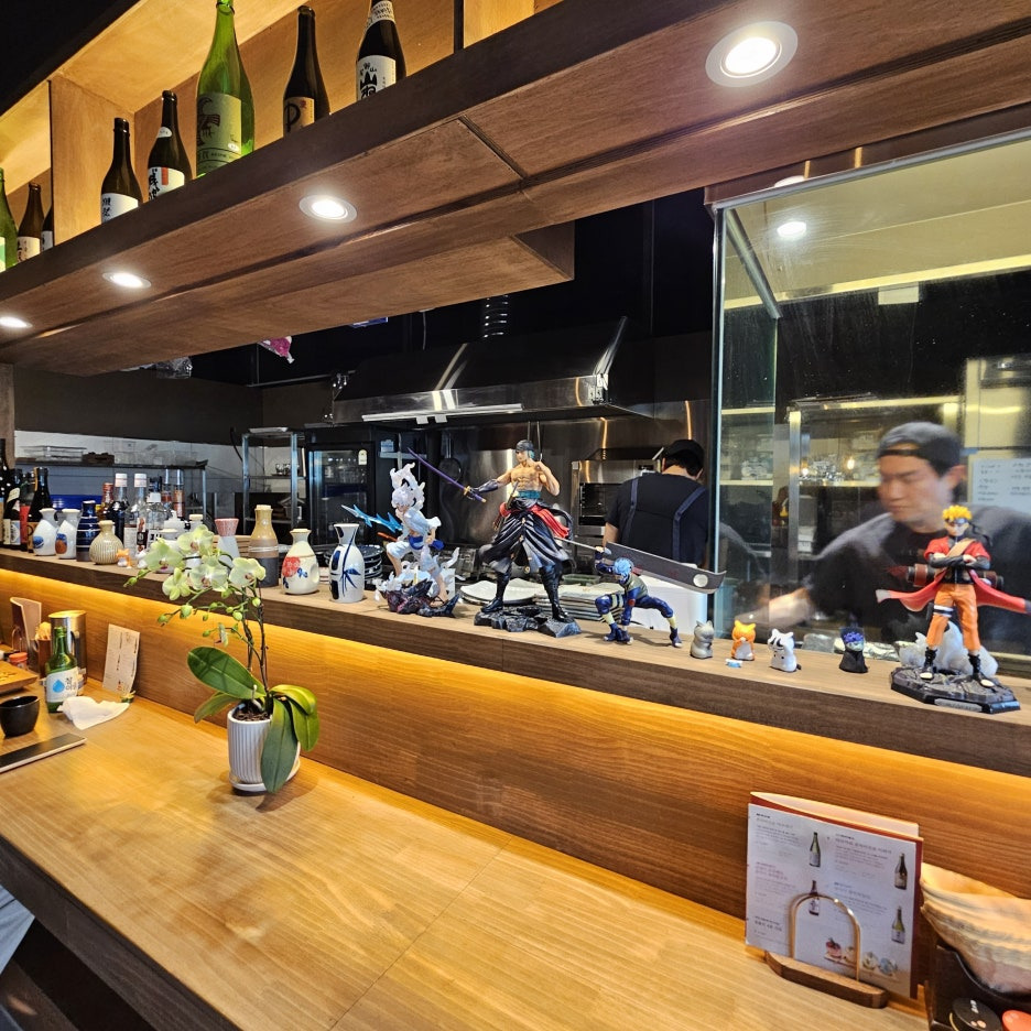우리는 바 테이블로 앉았다. 6명 정도 앉을 수 있는 공간이다. 나루토라는 이름답게 다양한 나루토 피규어가 놓여 있었었고, 원피스 피규어도 많았다.