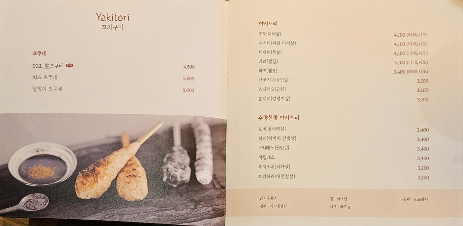 야키토리와 요리 메뉴들도 다양하다. 메인은 츠쿠네인듯. 특히, 기대되는 것이 껍질. 우리나라에서 정말 제대로 하는 곳을 본 적이 없어서... 이외에 간단한 안주들과 국물요리로 모츠나베도 있었다.