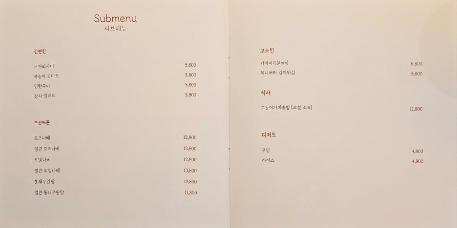 마지막은 식사 메뉴. 30분이 걸린다고 되어 있어서, 맨 처음에 주문을 했더니, 코스 중간에 나왔다.