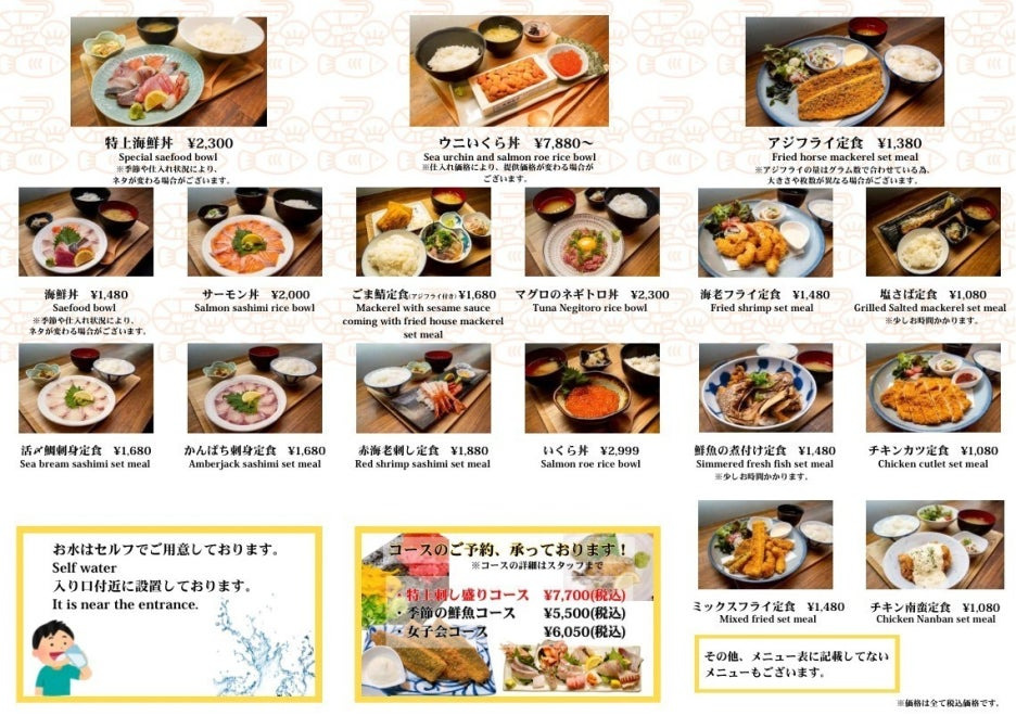 메뉴는 상당히 다양한데, 카이센동 부터, 아지후라이, 치킨난방, 고등어구이 정식 등 다양하다.