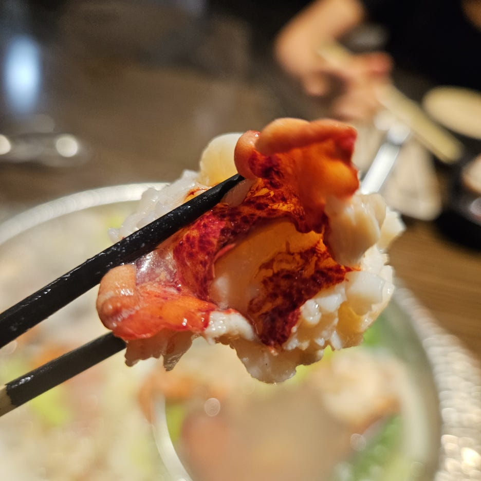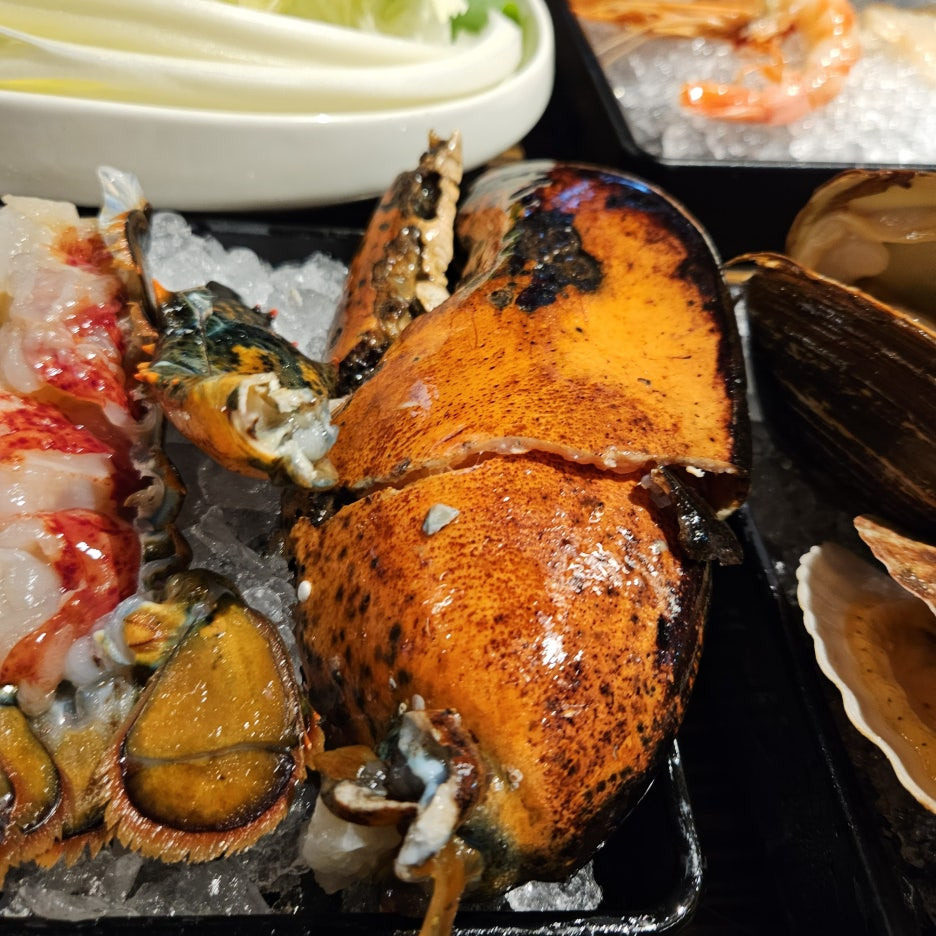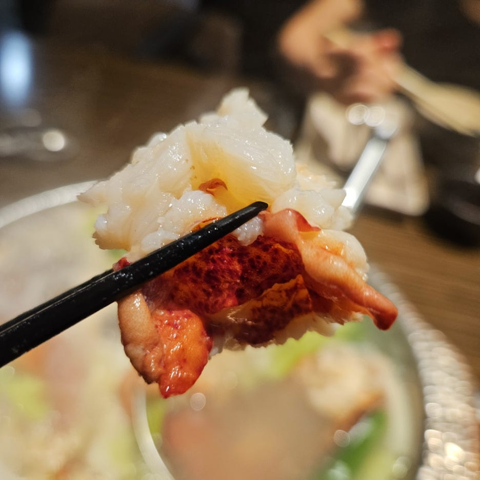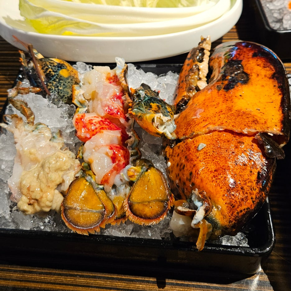 샤브샤브의 메인 재료. 랍스터 한 마리가 제대로 해체되어 있다. 참고로, 나중에는 이 랍스터의 특정 부위만을 요청해서 추가로 먹을 수 있었다. 아무래도 랍스터 테일 부분이 먹기가 쉽고 살도 많으니, 추가 주문 시 랍스터 테일만 주세요라고 하면 그렇게 가져다준다.