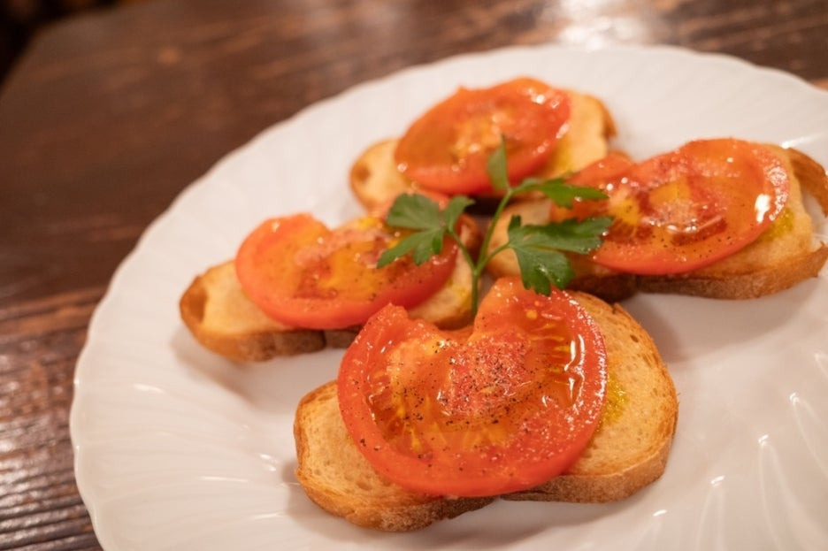 바게트 빵에 갈릭 소스에 버무려진 토마토가 올라간 요리. 파스타와 함께 많이 주문한다고.