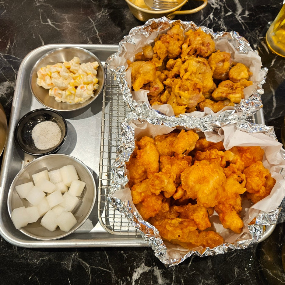 위쪽이 똥집, 아래쪽이 후라이드. 거기에 소금과 치킨무, 콘 샐러드가 함께 나온다. 하지만, 양념 소스는 함께 나오지 않는다. 메뉴를 보면 모든 양념 소스는 추가 금액이 있었다. 최소 1000원. 후라이드 반 마리도 똥집 튀김도 양은 꽤 많아서 좋다.