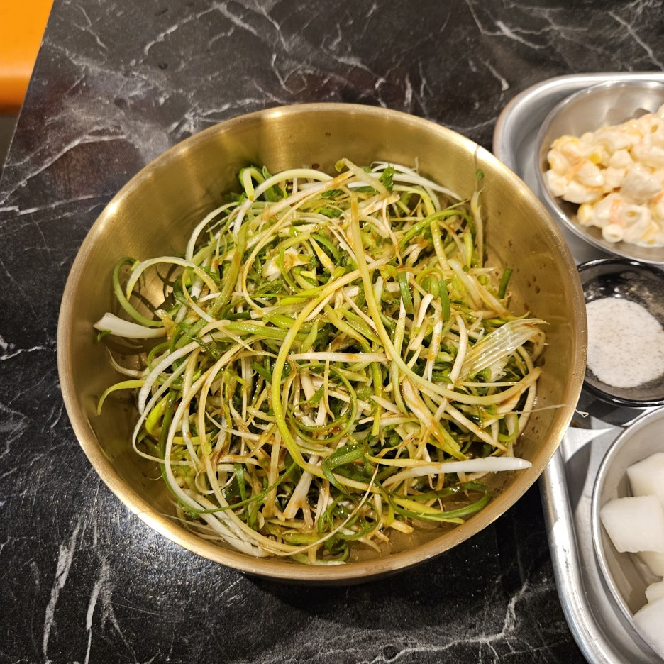 파채의 양념에 푹 찍어 먹어본 똥집 튀김. 튀김 겉에 양념이 스며들면서 튀김옷과 안의 재료를 하나로 뭉쳐준다. 튀김옷이 따로 노는 느낌이 없어지고, 간도 딱 맞게 아주 맛있어졌다. 이걸 발견해 주신 함께 한 아내분께 찬사를 보내 드린다.