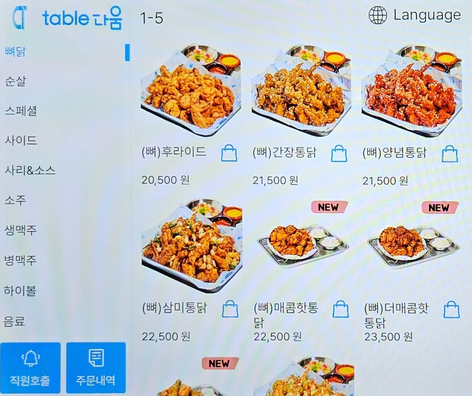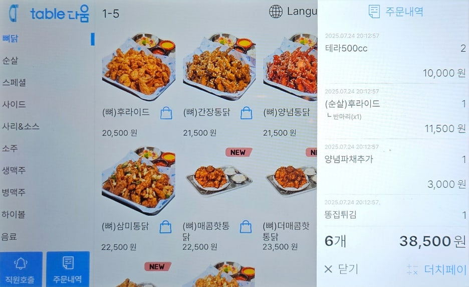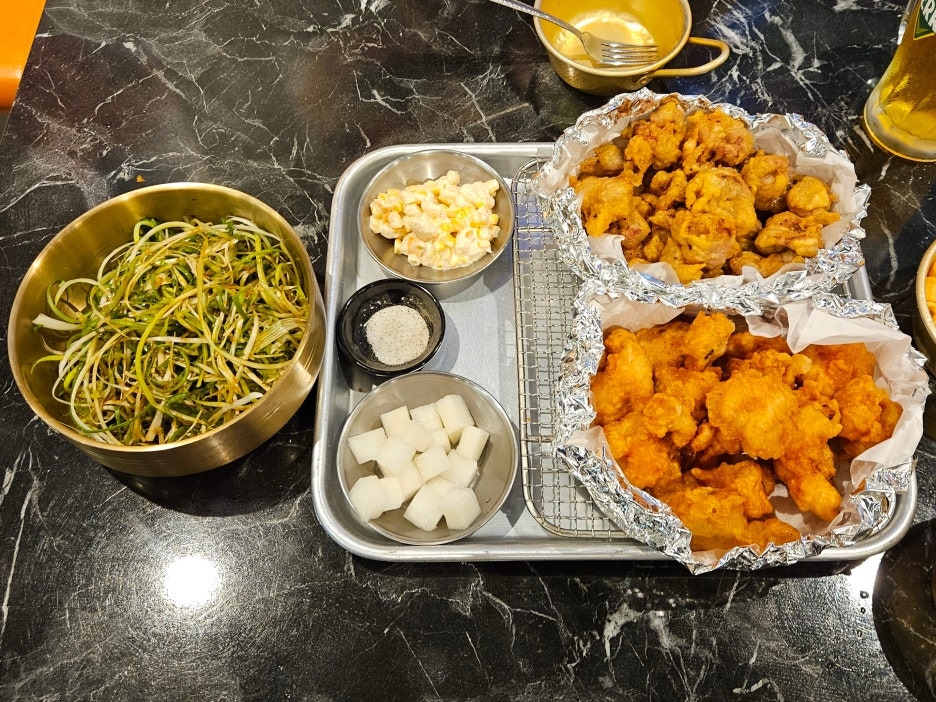 시원한 생맥주는 5천 원. 그리고, 순살 프라이드 반 마리와 똥집 튀김을 주문한다. 거기에 양념 파채 추가.