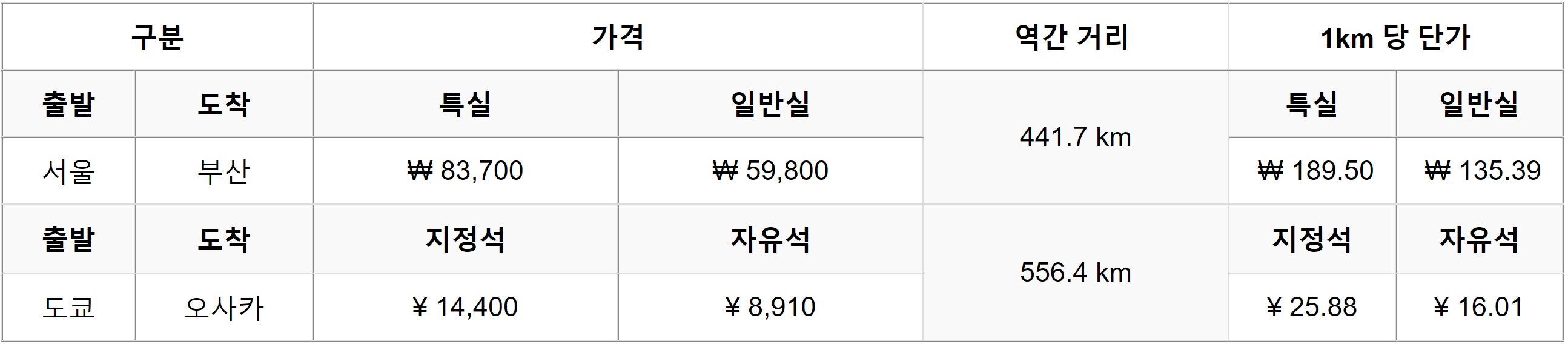 간단하게 먼저 우리나라와의 가격비교를 위해 같은 느낌의 두 도시간 이동으로 가격을 한번 계산해봤다.