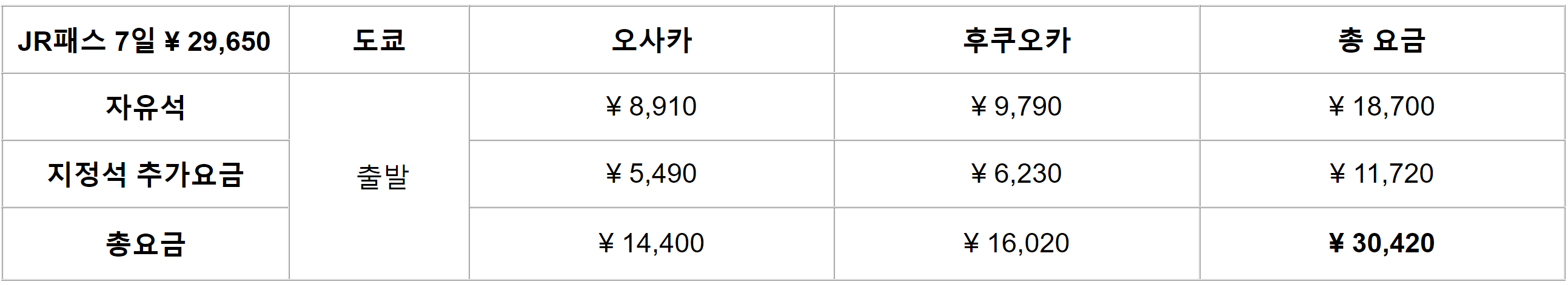 극댄적인 예이지만, 도쿄-오사카-후쿠오카 여행을 7일간 한다고 하면 아래와 같다.