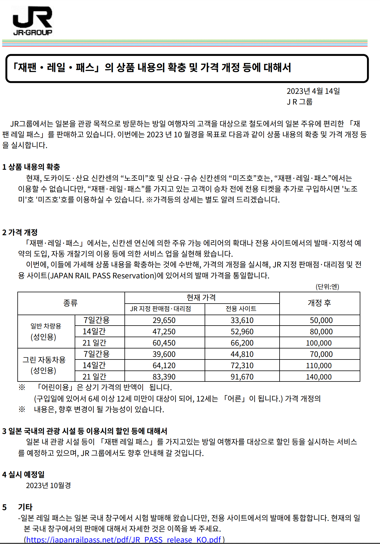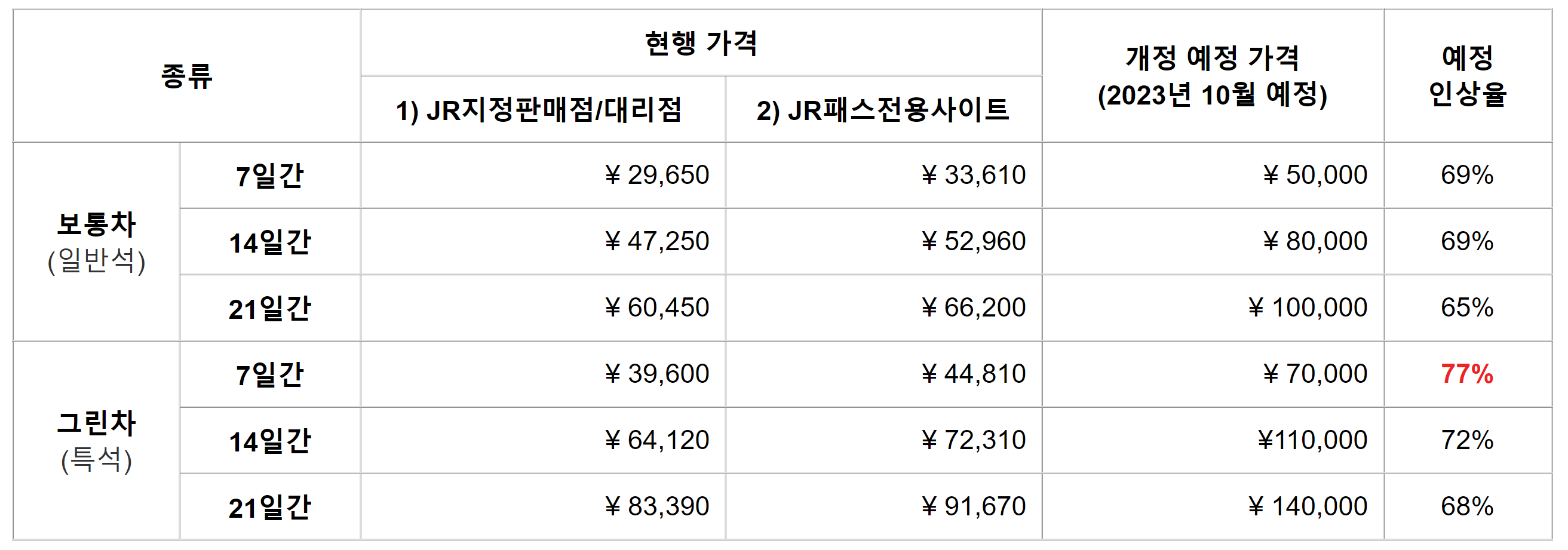 그런데, 이 JR패스가 2023년 10월, 무려 최대 77%나 가격 인상이 예정되어있다고 한다.