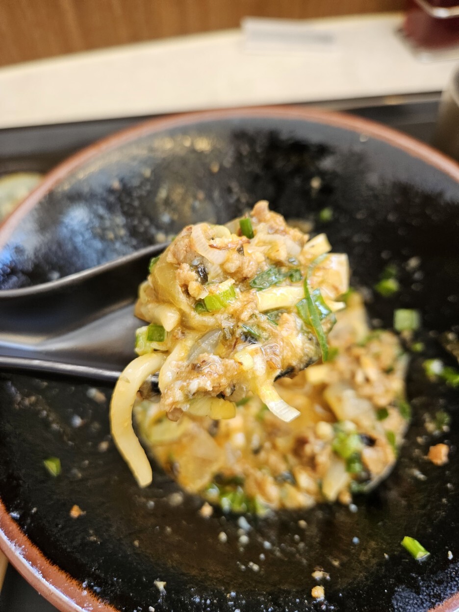 와리스프를 츠케지루에 붓는다. 그리고 숟가락으로 먹으면 된다. 가끔 씹히는 고기와 파의 잘 어우러진다. 마무리 국물로 딱 좋다.
