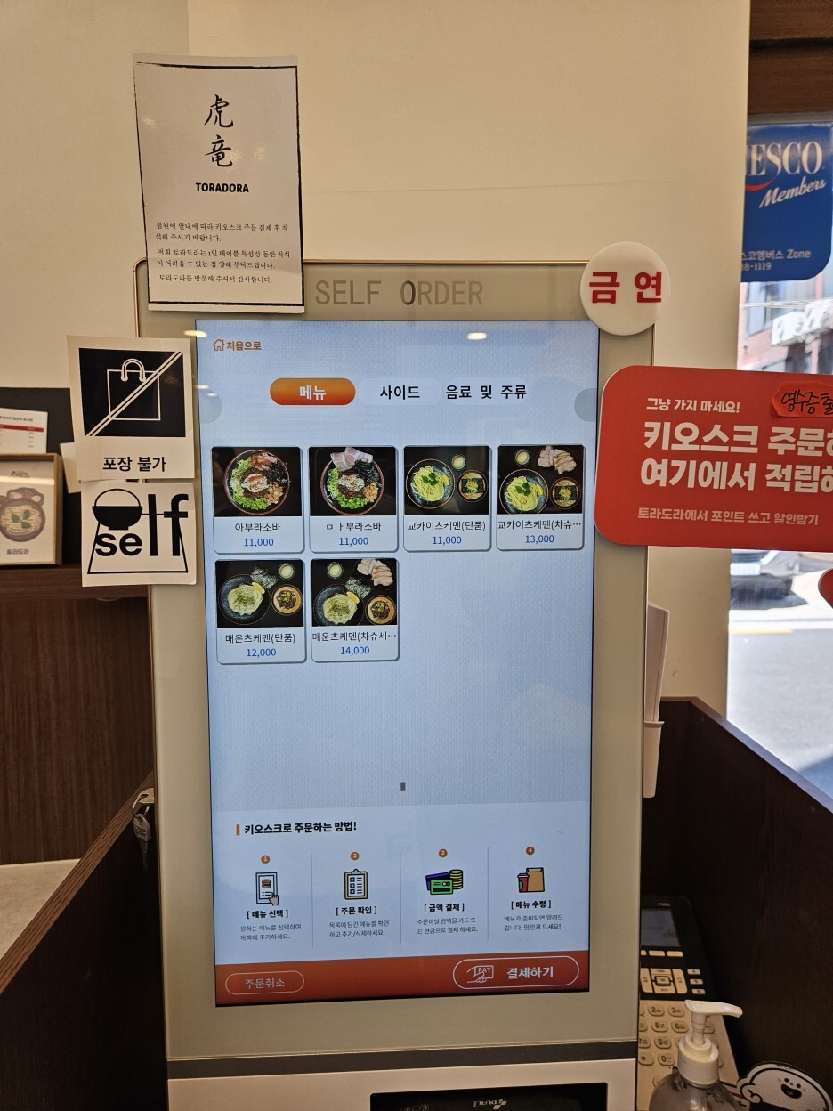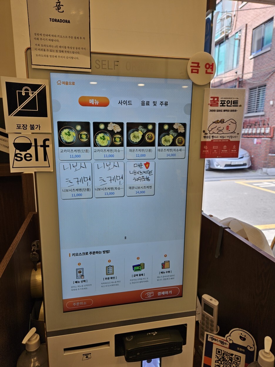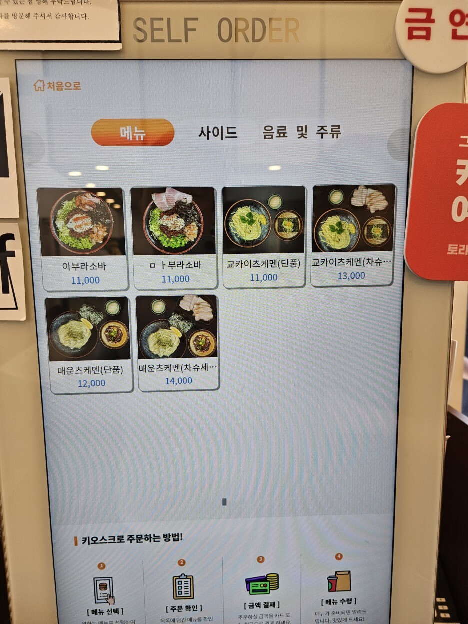 주문은 키오스크로 하면 된다. 메뉴를 선택하고 결제를 하면, 주문표가 나오는데, 자리를 잡은 후 종업원분께 그 주문표를 전달해 드리면 된다.