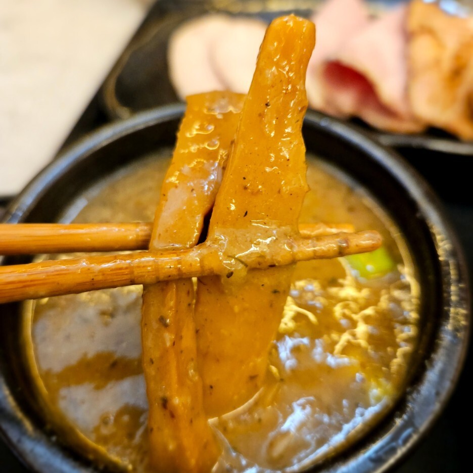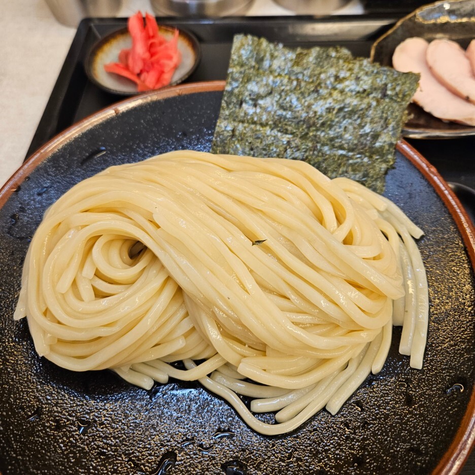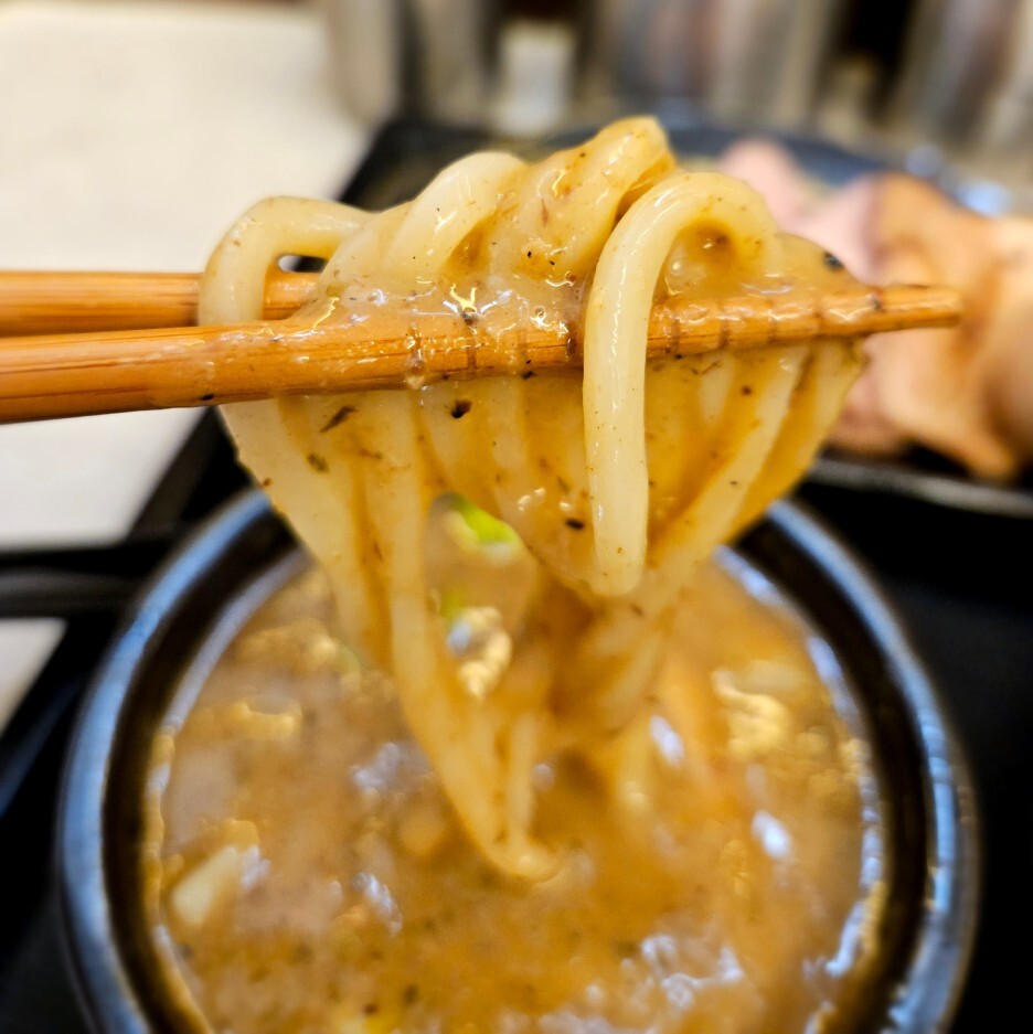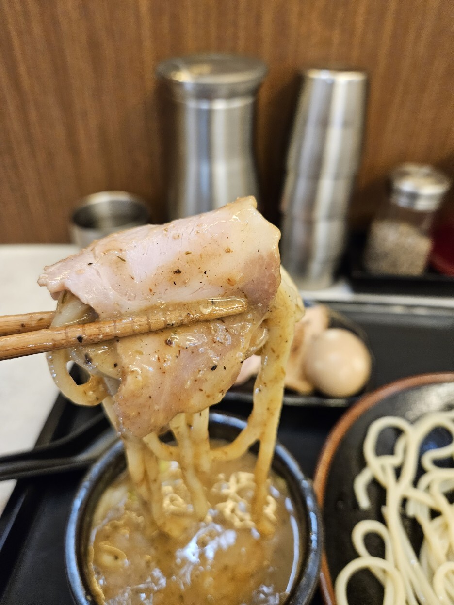 드디어 찍어 먹어보는 츠케멘. 강한 멸치향이 올라오고 엄청난 찰기의 쫄깃함의 면이 씹힌다. 아주 맛있다. 이 면은 정말 한국 최강일 수도 있겠다.