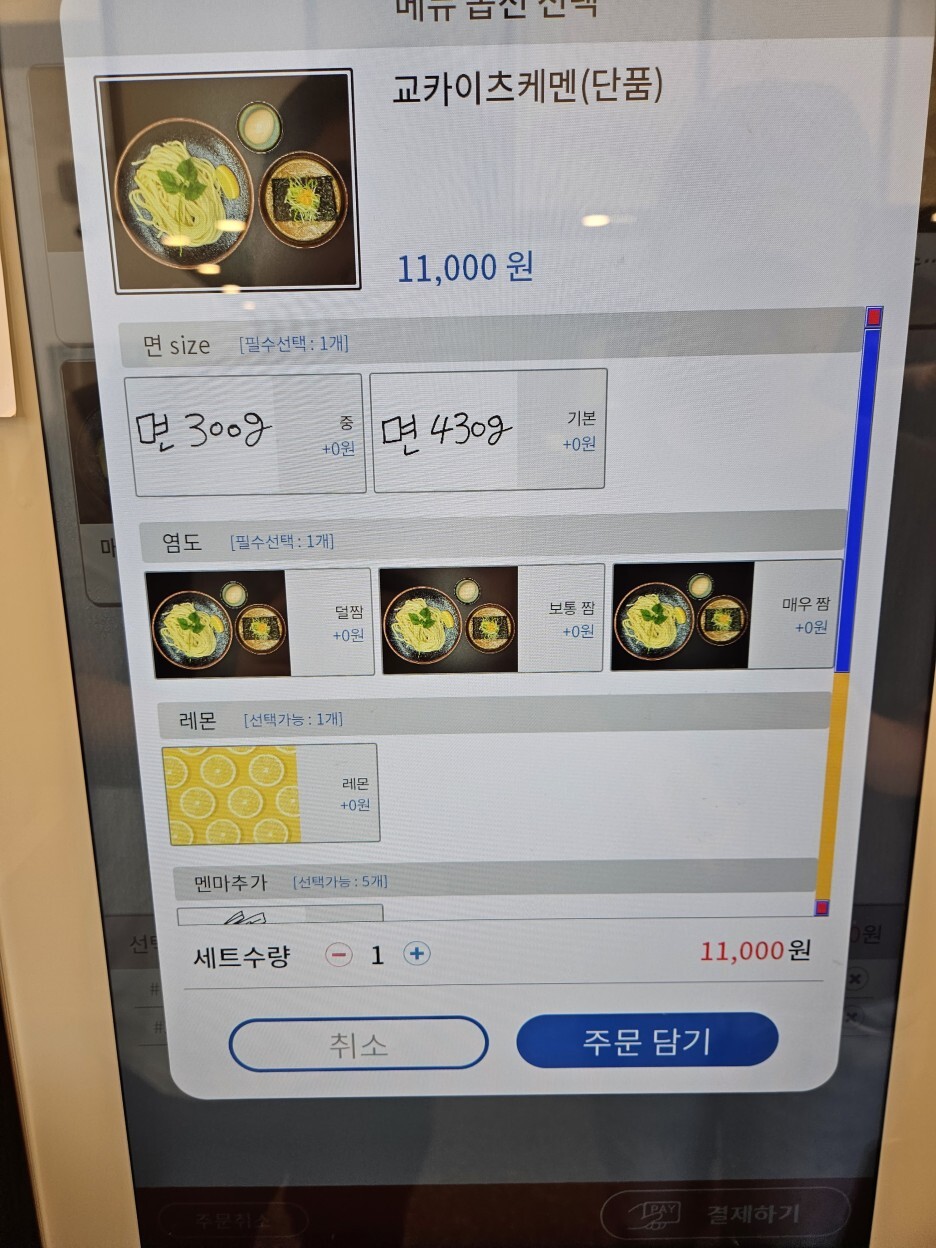 면의 양은 무료로 증가가 가능하다. 300g → 430g