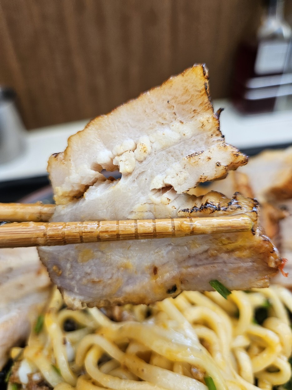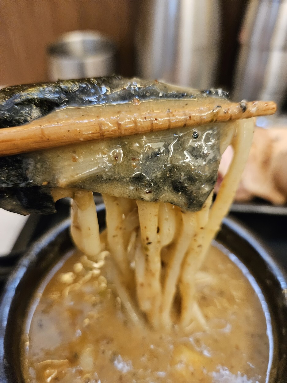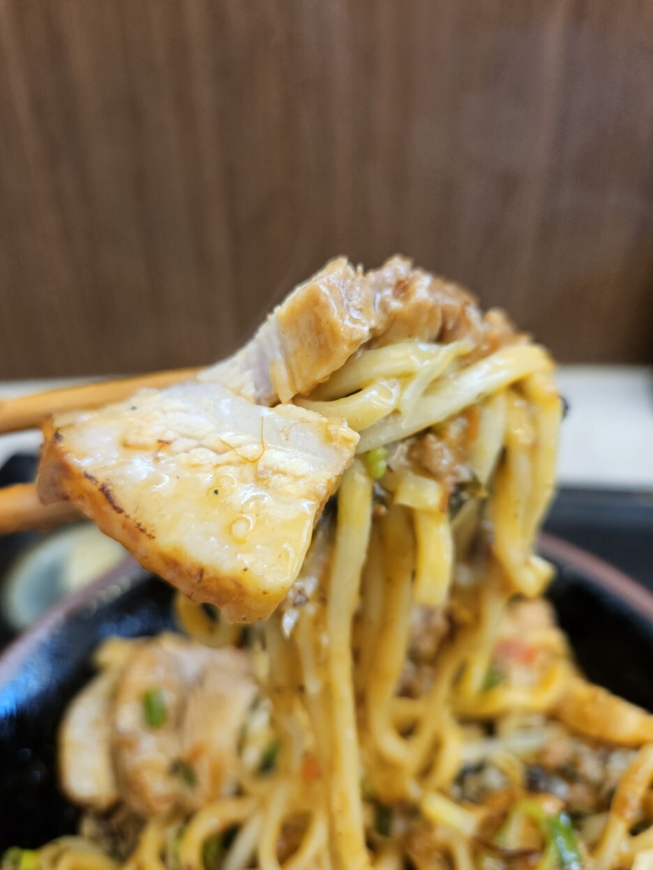 아부라소바면 어떻고 마제소바면 어떤가? 맛있기만 하면 된다. 면은 역시 쫄깃하고 통통하다. 츠케면과 동일한 면을 사용하니 맛이 없을 수 없다. 교카이가 아니니 멸치향은 전혀 나지 않는다. 그런데 기름짐이 강하다.