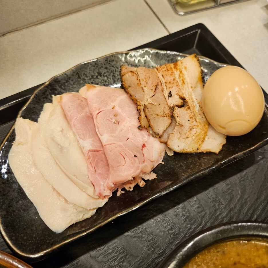 함께 주문한 차슈. 닭고기 차슈 3장과 돼지고기 햄 느낌의 차슈 2장, 구운 삼겹 차슈 한 장과 삶은 계란이 나온다.