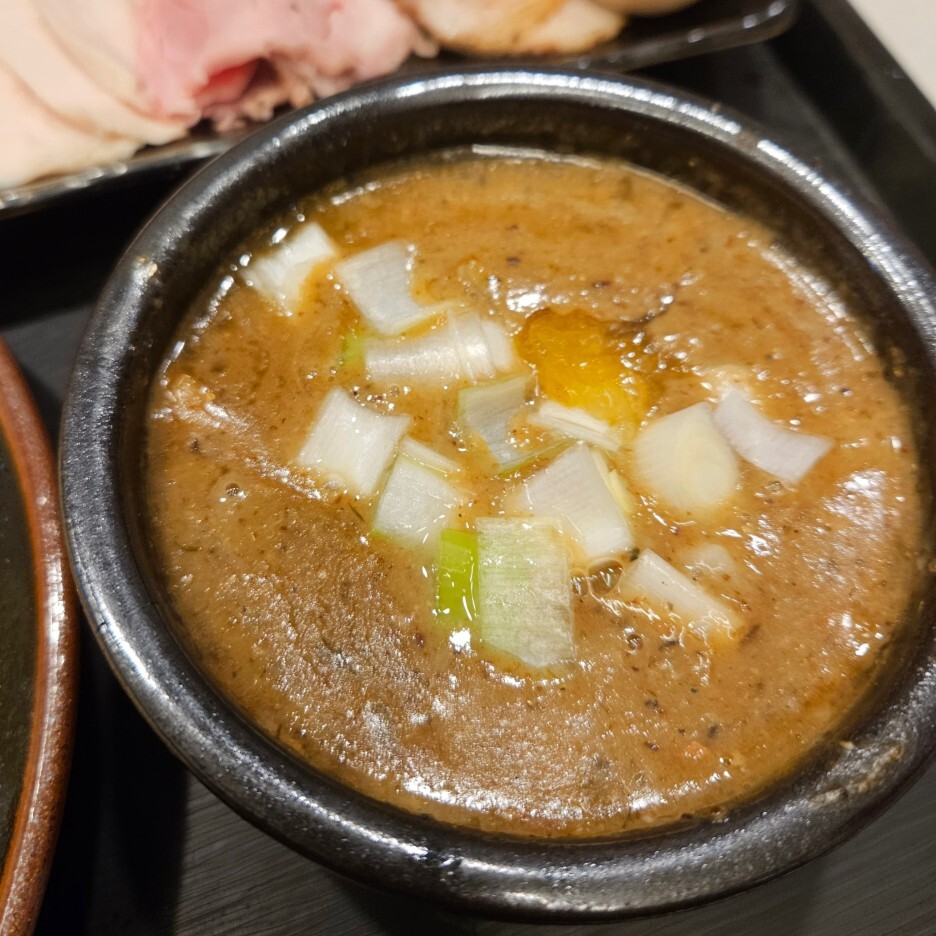 츠케멘의 모든 맛을 좌우하는 국물, 츠케지루의 모습. 음식을 받으면 강하게 올라오는 멸치향은 이 녀석 때문이다. 살짝 기름기 있는 국물에 올라가 있는 하얀색 파들의 모습이 인상적이다.