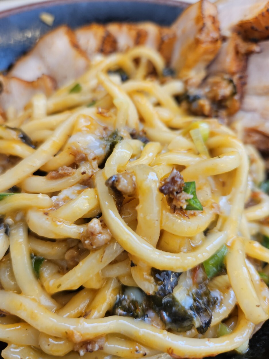 츠메멘의 면발이다. 살짝 어두운 기운이 흐르는 색감이다. 이 면이 두툼하면서도 정말 쫄깃하다. 아주 훌륭하다.